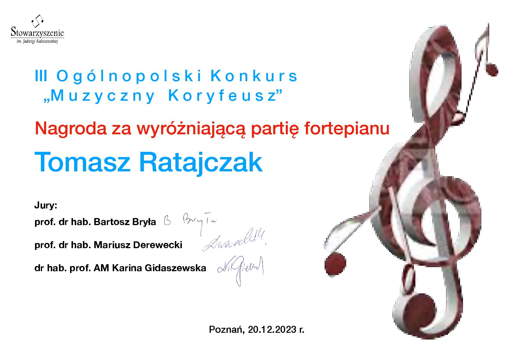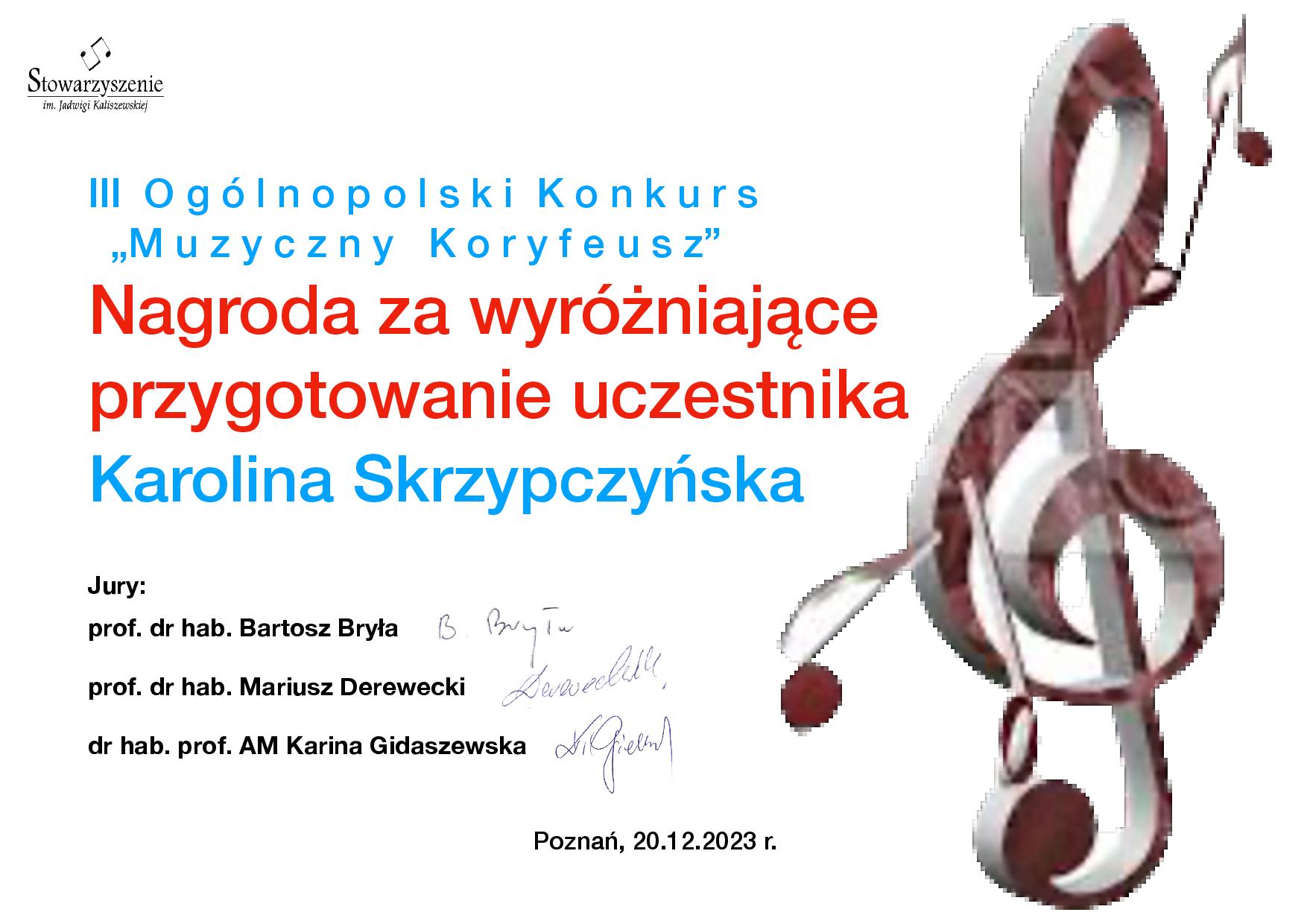 Pani Karolina Skrzypczyńska otrzymała dyplom za wyróżniające przygotowanie ucznia, a Pan Tomasz Ratajczak dyplom za wyróżniającą partię fortepianu.