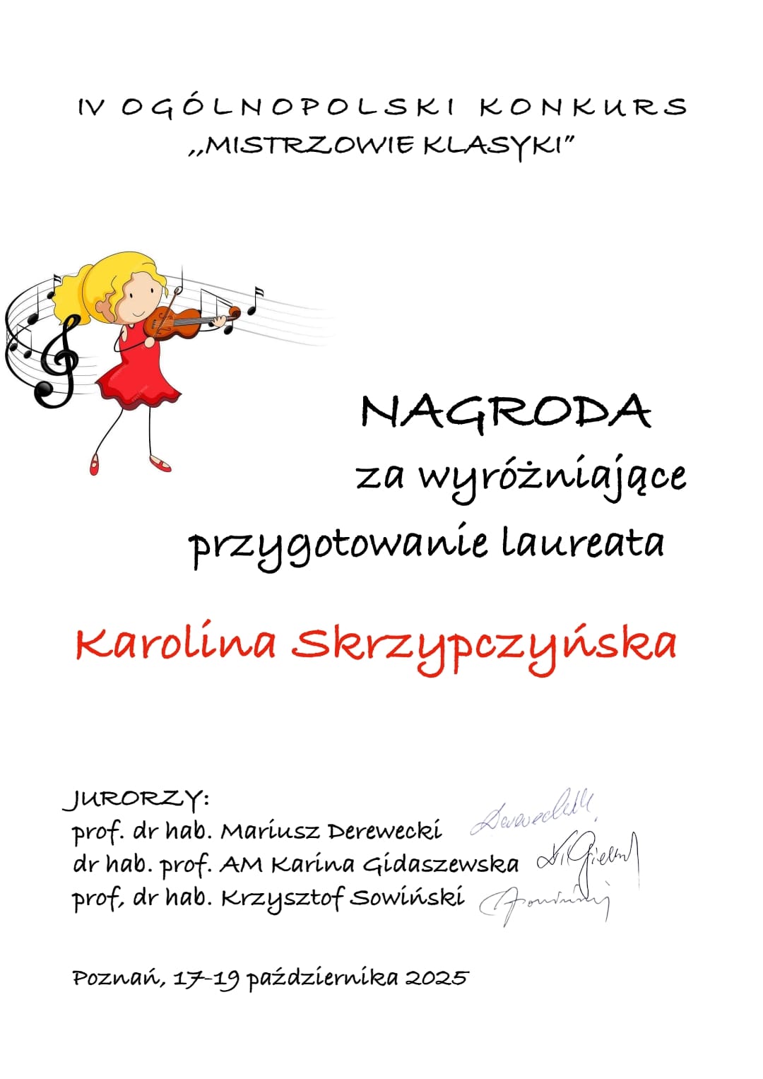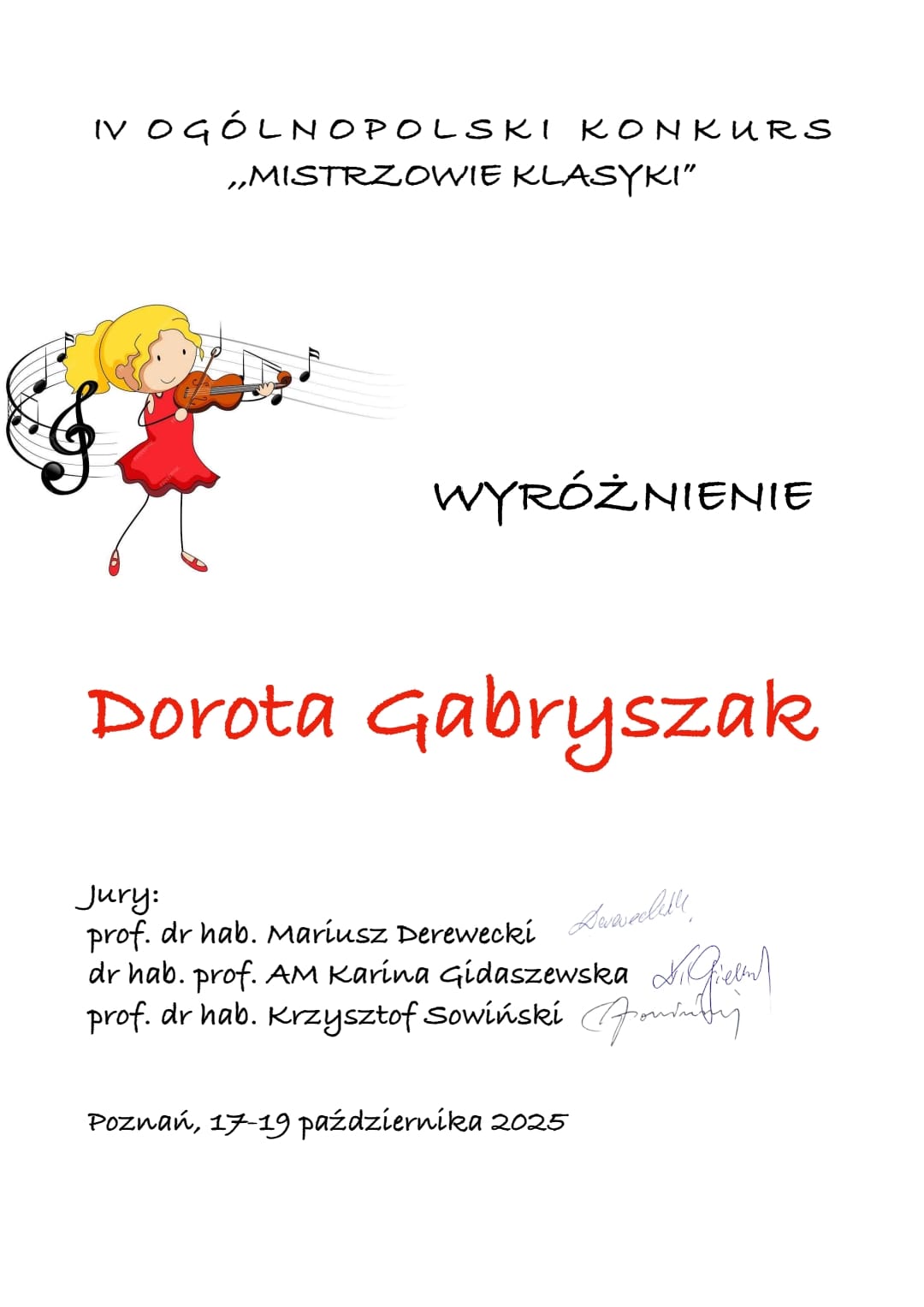 Z radością informujemy, że uczennica Państwowej Szkoły Muzycznej I stopnia w Jarocinie - Dorota Gabryszak - otrzymała wyróżnienie w IV Ogólnopolskim Konkursie „Mistrzowie Klasyki”, który odbył się w dniach 17-19 października 2025 roku w Poznaniu.