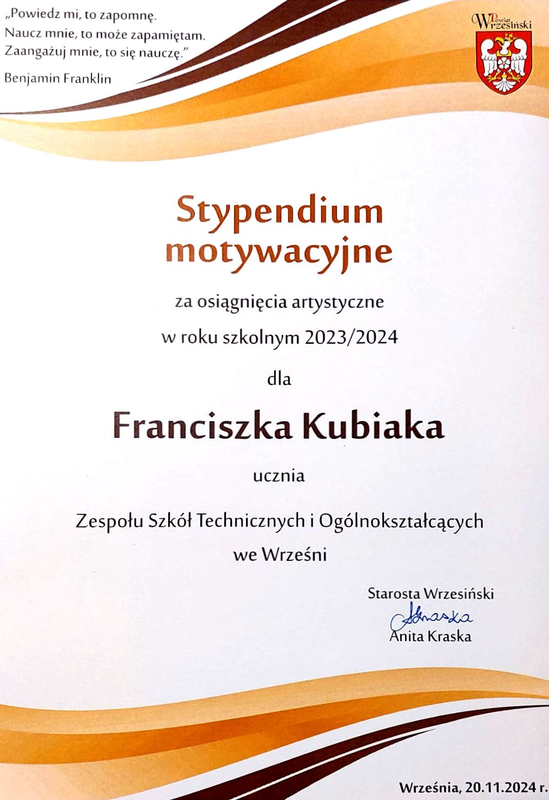 Miło nam poinformować, że Franciszek Kubiak, uczeń klasy saksofonu Pana Jacka Węglarza otrzymał stypendium Starosty Wrzesińskiego za osiągnięcia artystyczne w roku szkolnym 2023/2024.