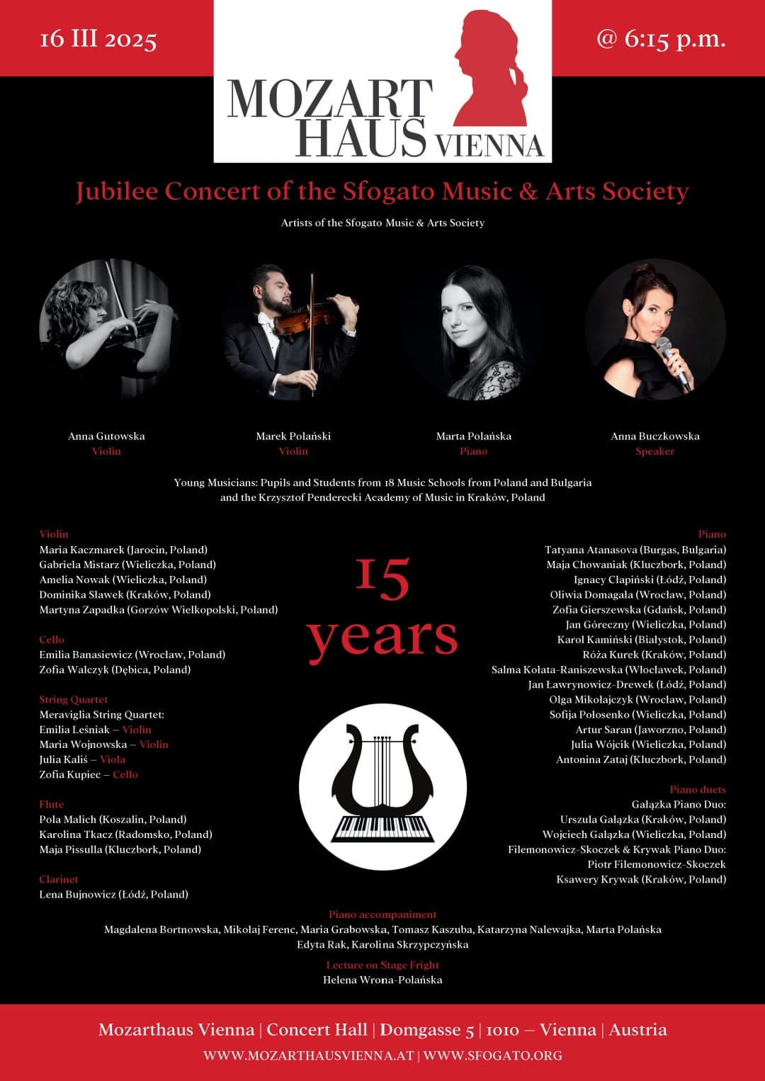 Z dumą informujemy, że Maria Kaczmarek wystąpiła 16 marca 2025 roku w sali koncertowej Domu Wolfganga Amadeusza Mozarta w Wiedniu, stolicy Austrii.
