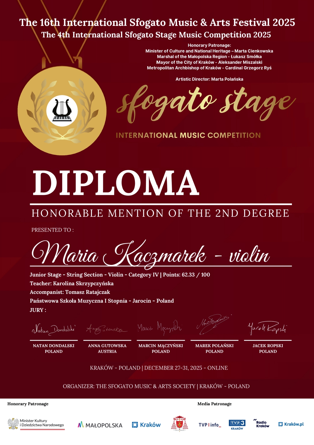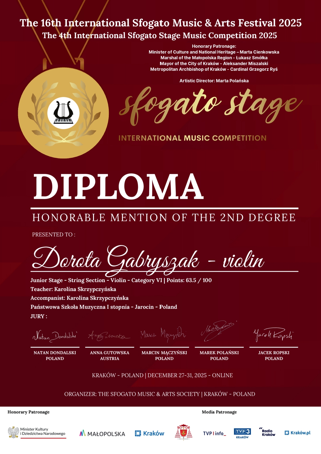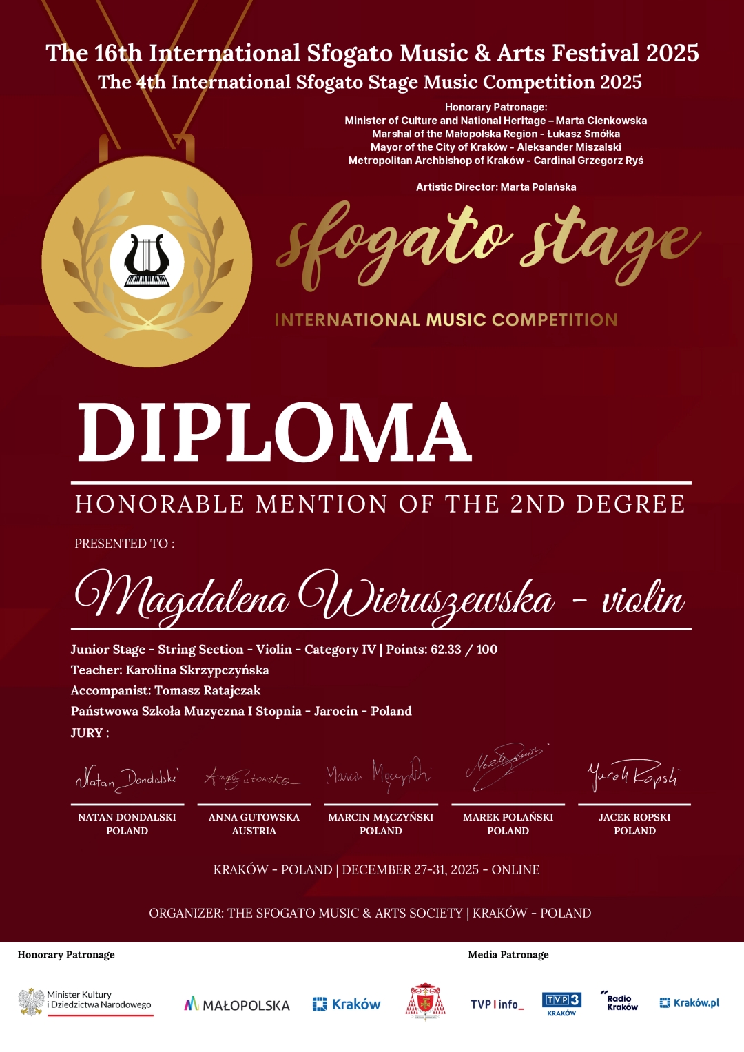 Uczennice klasy skrzypiec Państwowej Szkoły Muzycznej I stopnia w Jarocinie odniosły sukces podczas 4. Międzynarodowego Konkursu "Sfogato Stage 2025", realizowanego w ramach 16. Międzynarodowego Festiwalu "Sfogato 2025". Wydarzenie odbyło się w formule online w dniach od 27 do 31 grudnia 2025 roku w Krakowie.