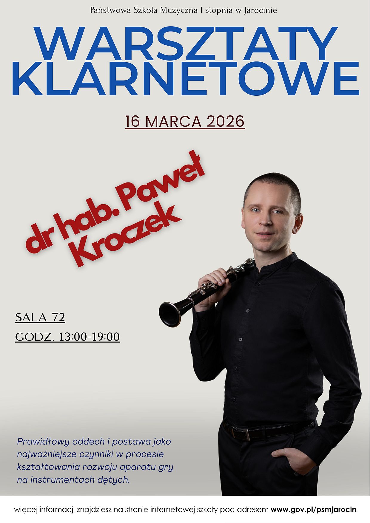 W poniedziałek 16 marca 2026 roku w Państwowej Szkole Muzycznej I stopnia w Jarocinie odbędą się warsztaty klarnetowe z dr hab. Pawłem Kroczkiem.
