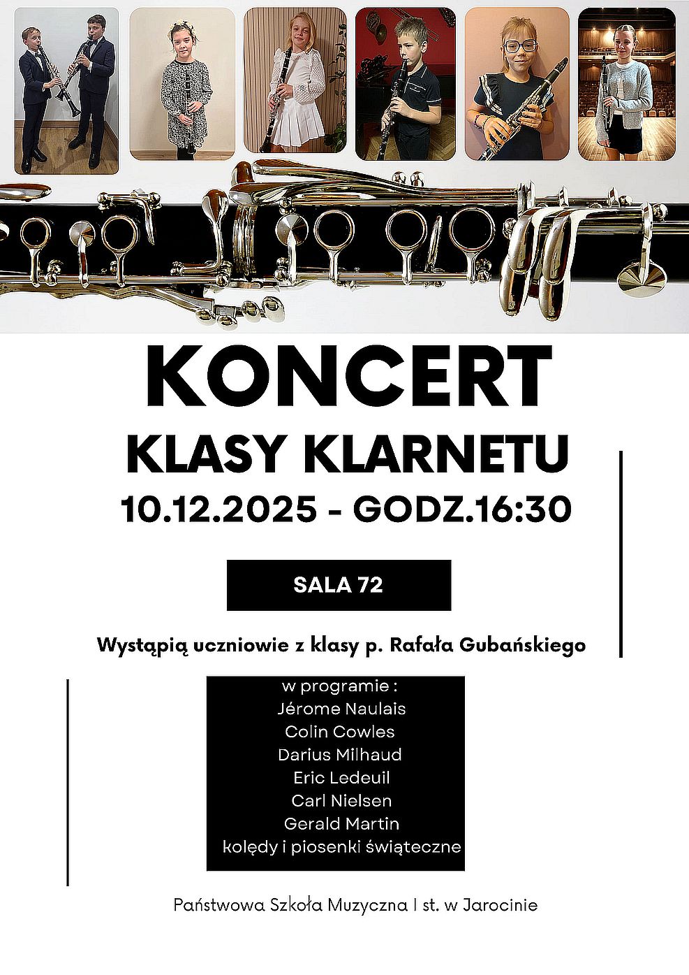 Serdecznie zapraszamy na wyjątkowy koncert, podczas którego wystąpią młodzi i utalentowani klarneciści z klasy pana Rafała Gubańskiego.