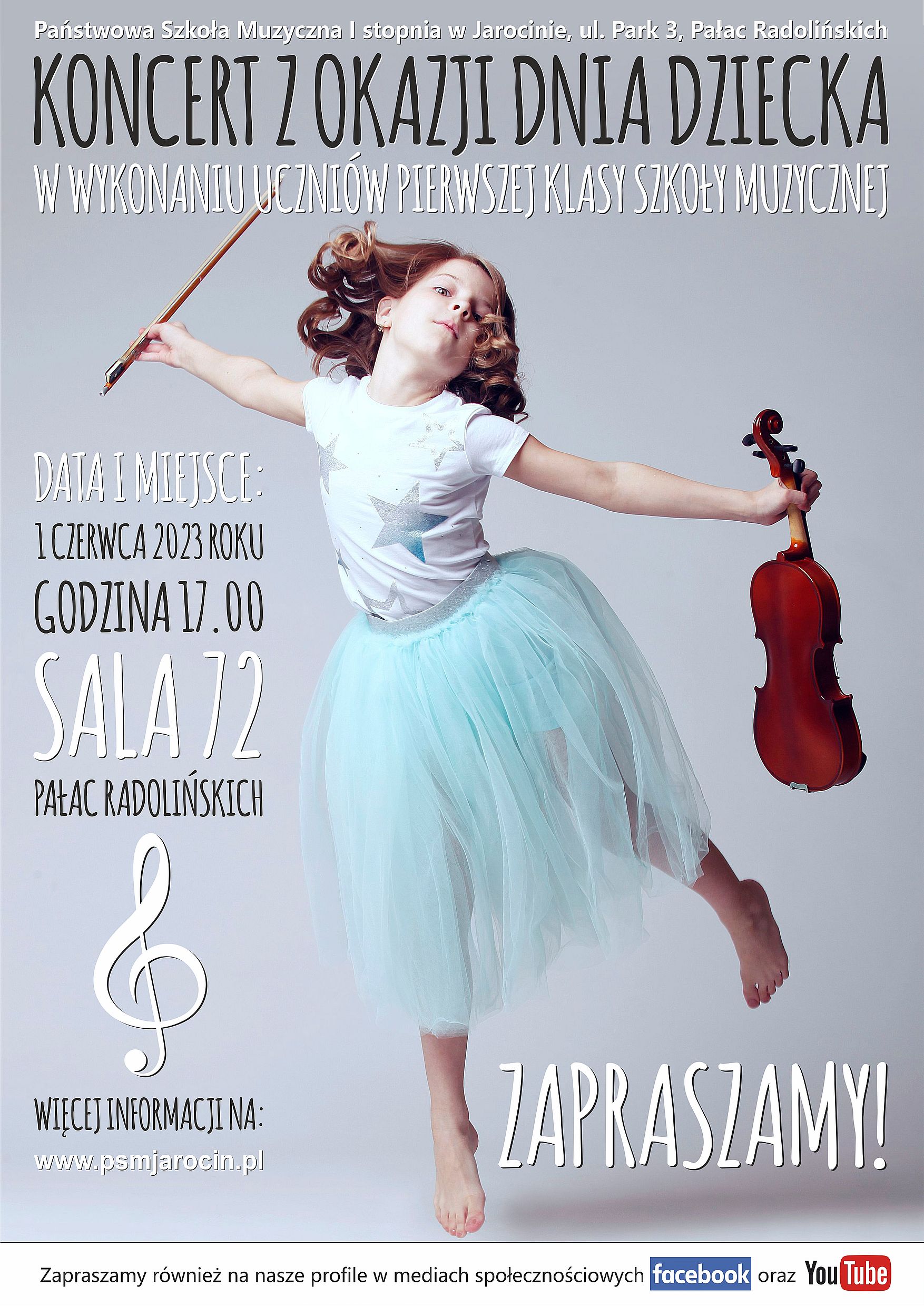Jak co roku pragniemy serdecznie zaprosić Państwa na Koncert z okazji Dnia Dziecka w wykonaniu uczniów pierwszej klasy Państwowej Szkoły Muzycznej I stopnia w Jarocinie.