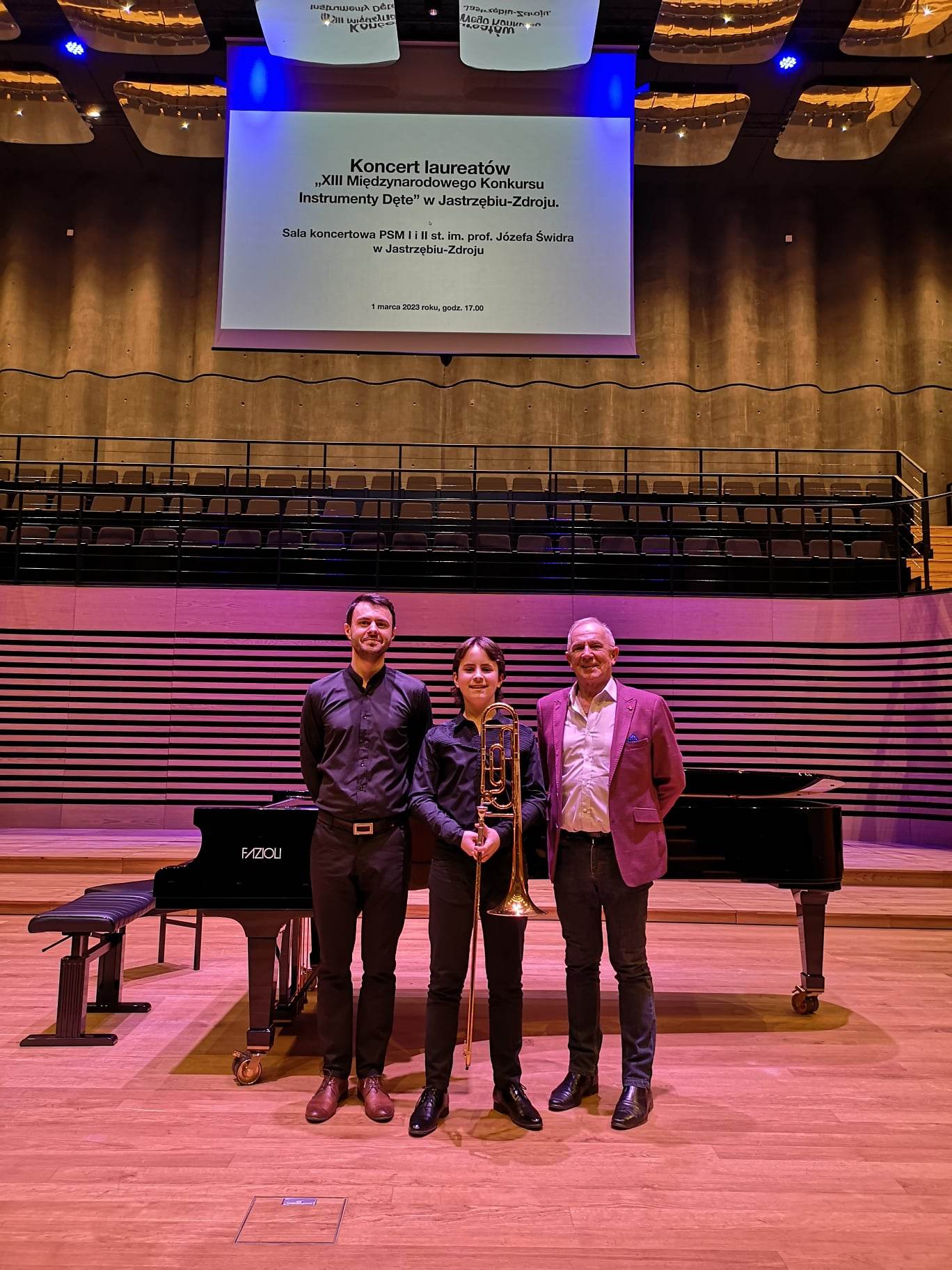 1 marca 2023 r. po raz kolejny wybraliśmy się w podróż. Kierunek – Jastrzębie Zdrój, cel – koncert laureatów XIII Międzynarodowego Konkursu "Instrumenty Dęte". Tym razem zdobywca I miejsca Tomasz Krupa z klasy puzonu Tadeusza Wróbla przy akompaniamencie Piotra Dudy przeniósł słuchaczy w magiczny świat muzyki barokowej, prezentując Sonatę F cz. I i II B. Marcellego. Przed Nimi już wkrótce kolejna podróż.