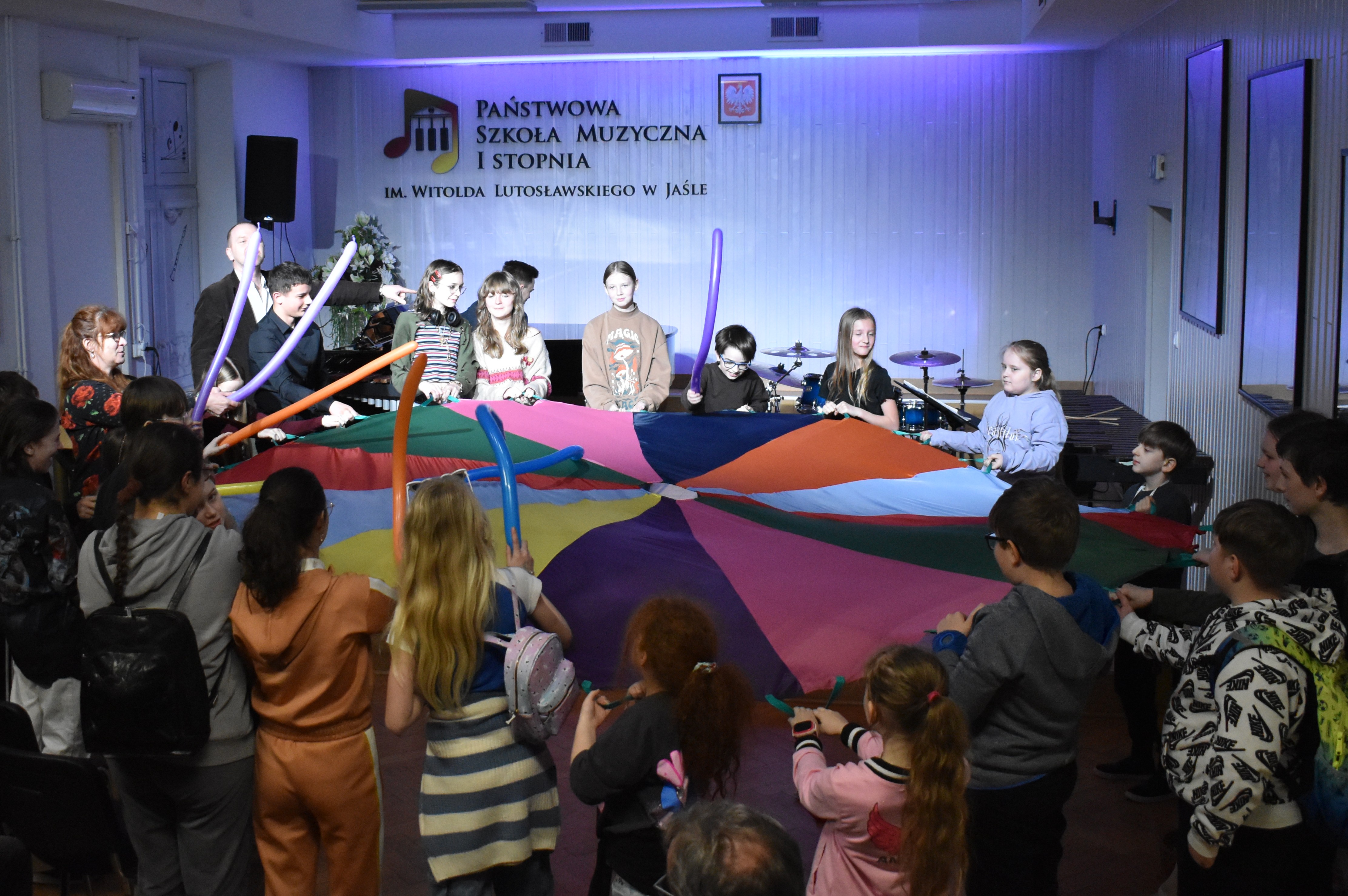 Podczas tego wyjątkowego dnia nie zabrakło rytmicznych interakcji z publicznością, edukacyjnego mini konkursu z nagrodami, kolorowanek w szatni szkoły oraz tradycyjnego elementu – największego instrumentu świata. Tym razem, na wielkiej, kolorowej membranie, wielkimi pałeczkami wystukiwaliśmy synkopowane rytmy.
