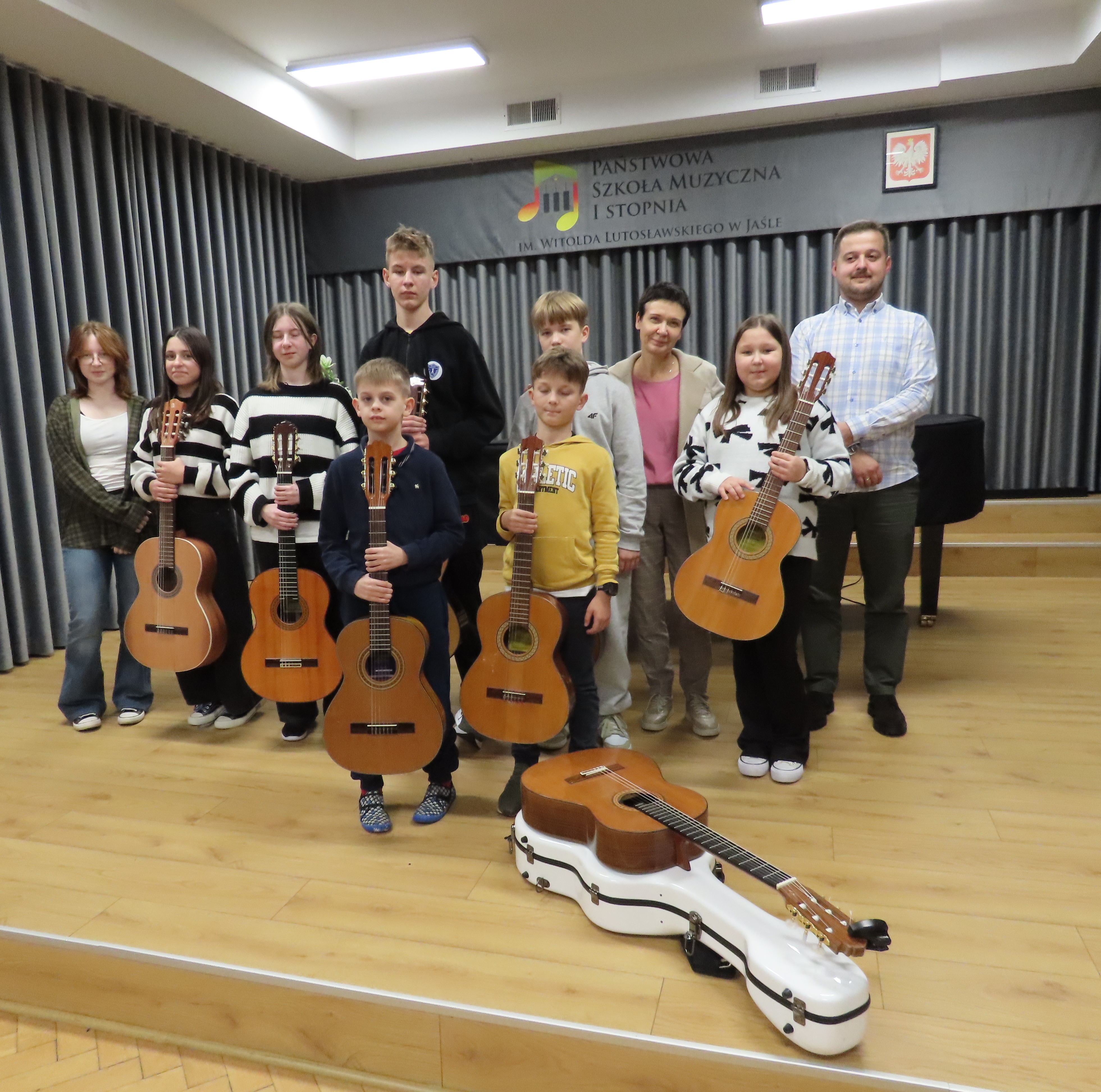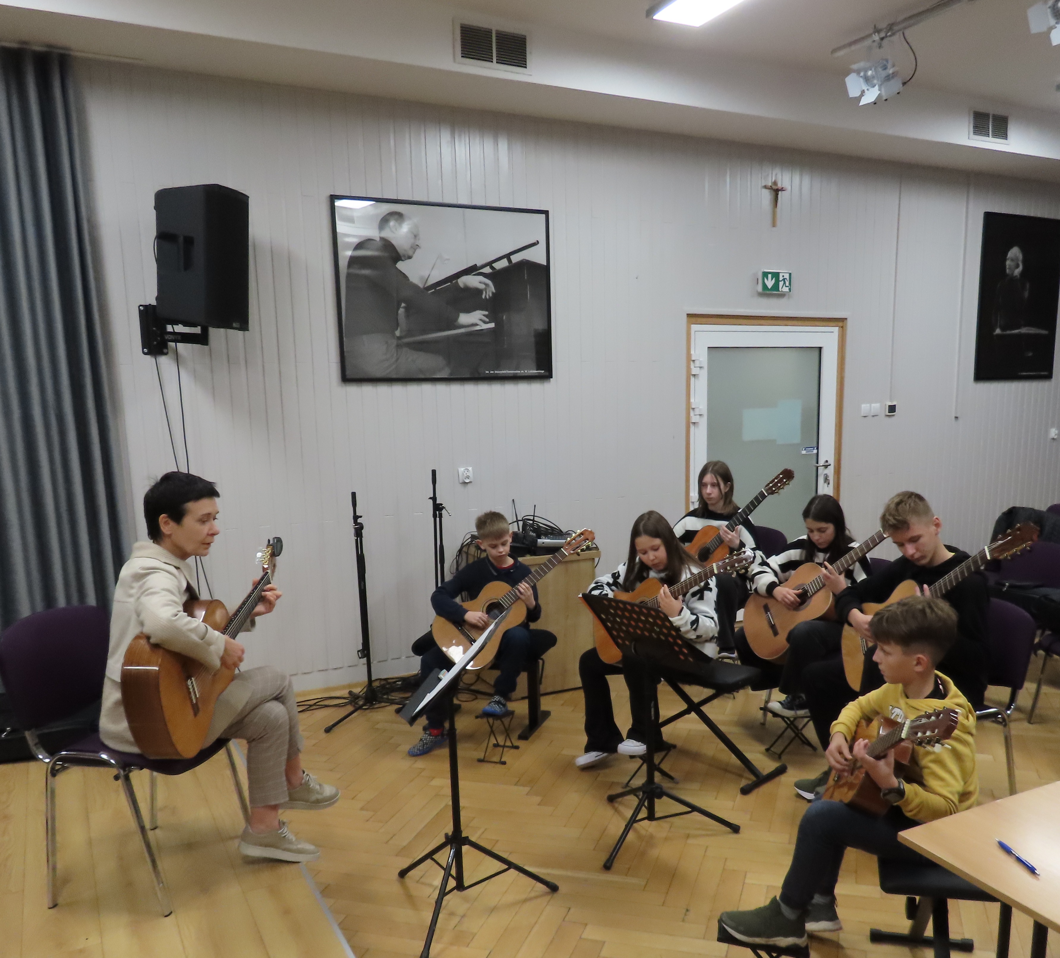 Poprowadzone przez panią Tatianę Stachak kilkugodzinne warsztaty gitarowe zgromadziły uczniów, nauczycieli i rodziców. Podczas prowadzenia zajęć pani Tatiana szczególną uwagę zwracała na aparat wykonawczy, sposób wydobycia dźwięku i jego brzmienie. Uczniowie bardzo szybko przyswajali sobie wiedzę przekazywaną przez prowadzącą. Efekty pracy można było usłyszeć od razu.