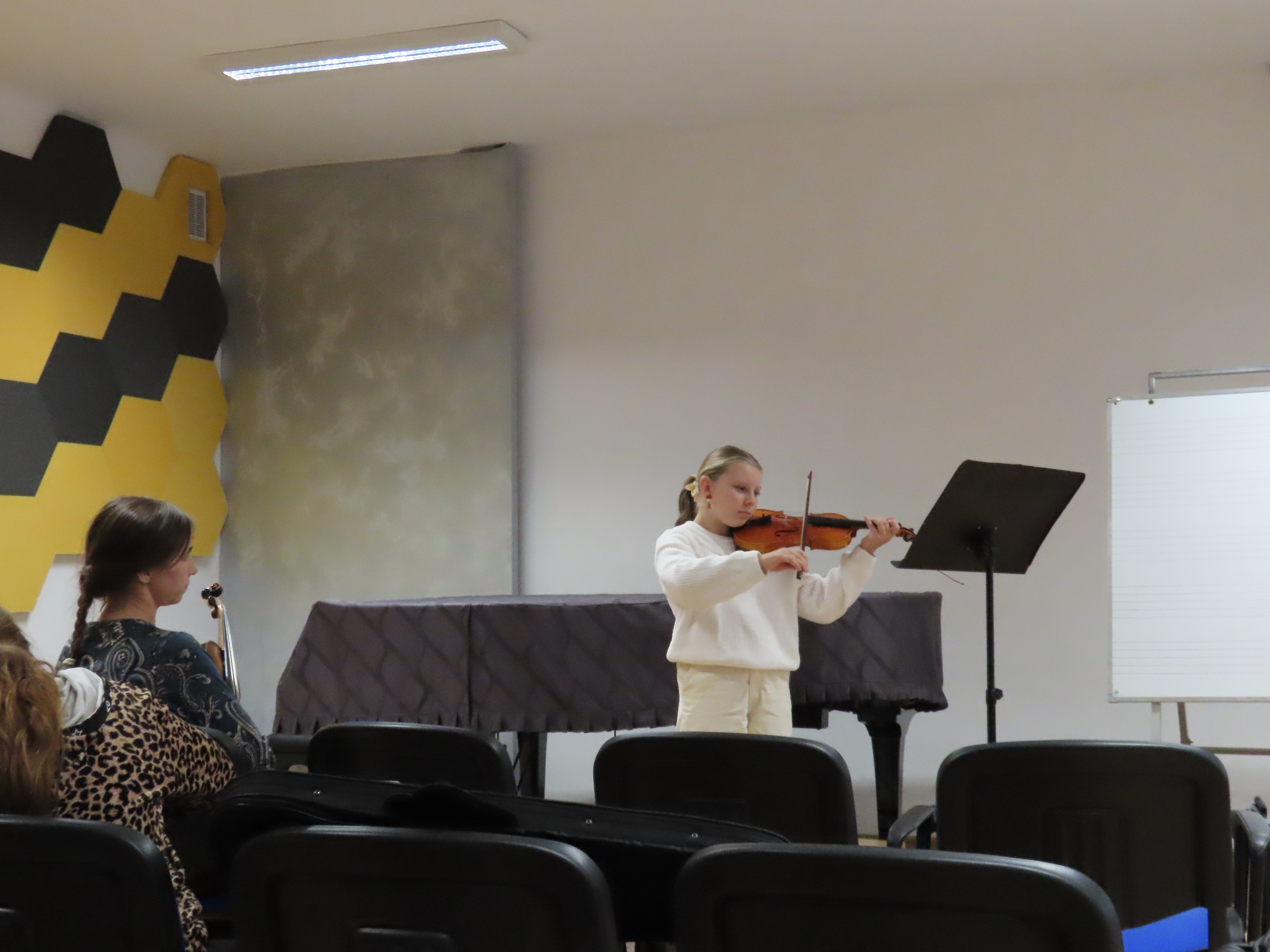 W dniu 10 grudnia sala kameralna Państwowej Szkoły Muzycznej I stopnia w Jaśle stała się centrum intensywnego rozwoju artystycznego dla młodych skrzypków, goszcząc na warsztatach skrzypcowych wybitną instrumentalistkę i pedagog dr Aleksandrę Kuls z Akademii Muzycznej w Krakowie. Wydarzenie to, zorganizowane z myślą o podniesieniu umiejętności technicznych i interpretacyjnych uczniów, spotkało się z dużym zainteresowaniem uczniów, nauczycieli i rodziców. Prowadzone warsztaty miały charakter otwartych lekcji mistrzowskich, podczas których uczniowie z klasy skrzypiec prezentowali przygotowane utwory. Dr Aleksandra Kuls koncentrowała się na korygowaniu błędów technicznych, akcentując jednocześnie znaczenie świadomej interpretacji muzycznej, frazowania, budowania narracji w utworze. Dzięki wytężonej pracy zaproszonej artystki uczniowie zyskali nie tylko konkretne wskazówki, ale i ogromną dawkę motywacji do dalszej pracy. Warsztaty skrzypcowe z dr Aleksandrą Kuls stanowią ważny element w planie pracy sekcji instrumentalnej, potwierdzając jej zaangażowanie w zapewnienie uczniom dostępu do najwyższej klasy edukacji muzycznej. Pozytywny oddźwięk wśród uczestników i pedagogów świadczy o sukcesie zorganizowanych warsztatów, który z pewnością przyczyni się do dalszego artystycznego rozwoju klasy skrzypiec w naszej szkole.