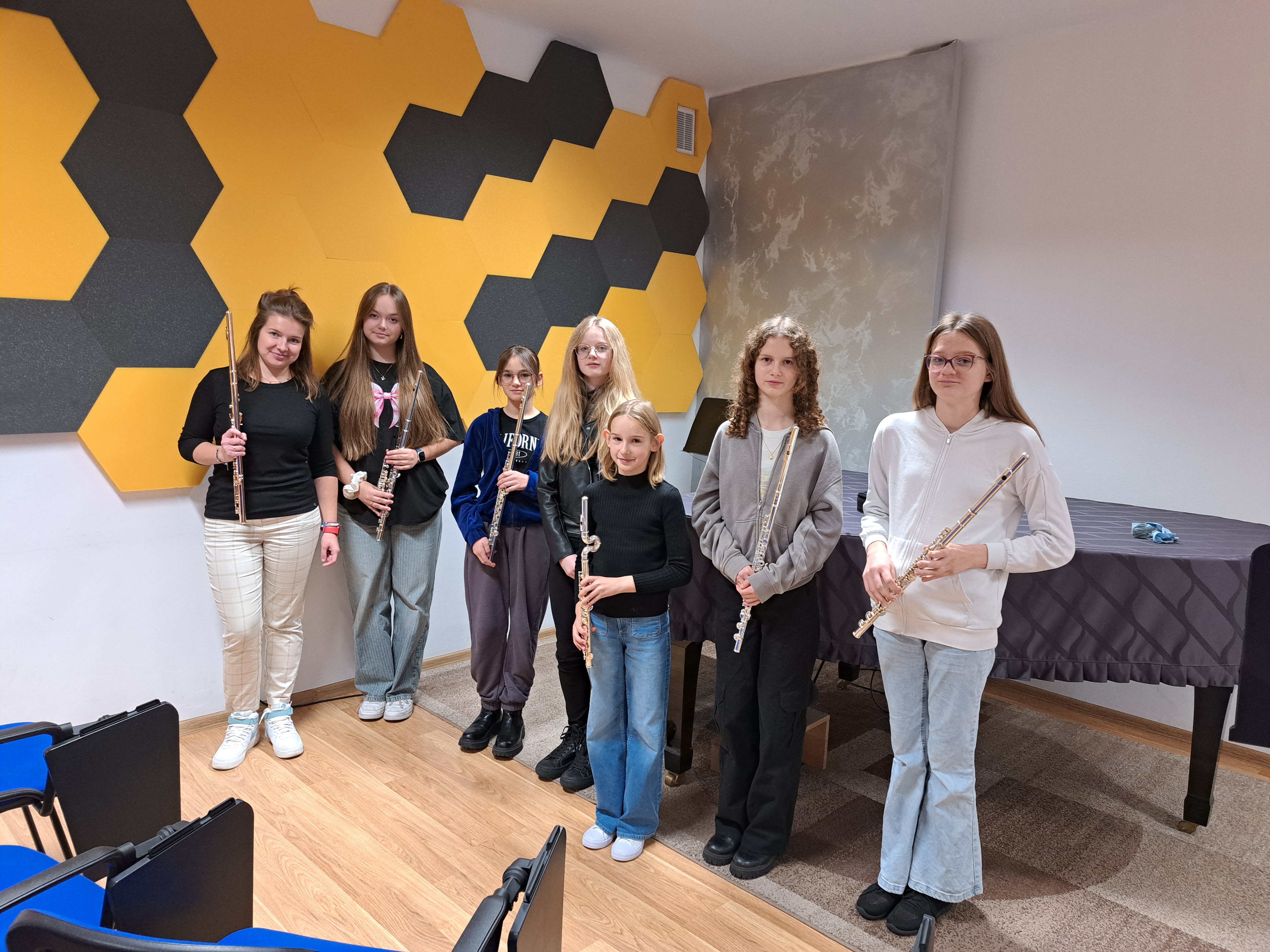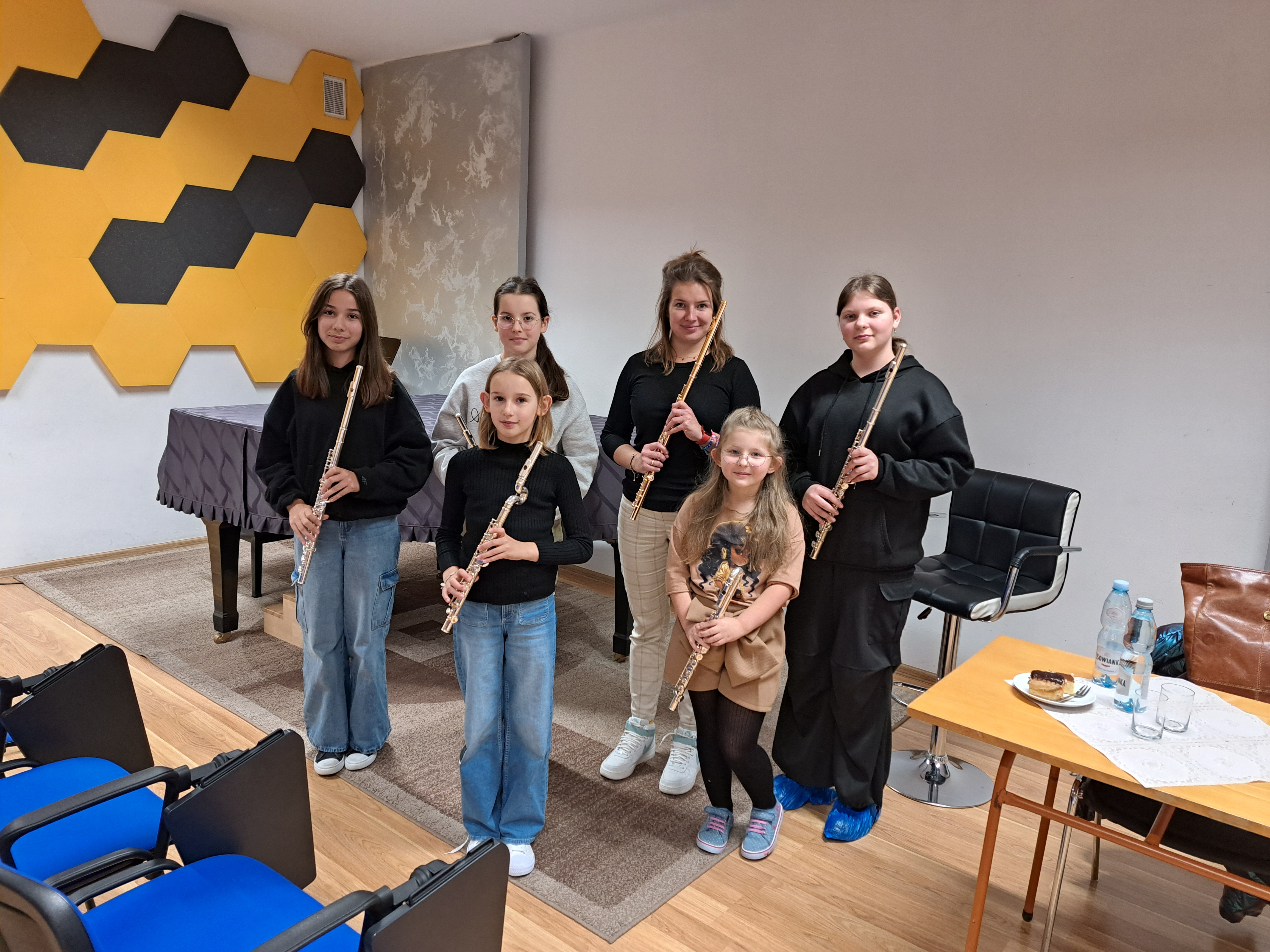 Spotkanie to było doskonałą okazją do wzbogacenia wiedzy i umiejętności w zakresie tych dwóch wyjątkowych instrumentów. Pan Piotr, doświadczony trębacz, oraz Pani Kornelia, utalentowana flecistka, dzielili się swoimi doświadczeniami zarówno technicznymi, jak i artystycznymi, wprowadzając młodych muzyków w tajniki właściwego warsztatu gry oraz interpretacji muzycznej.