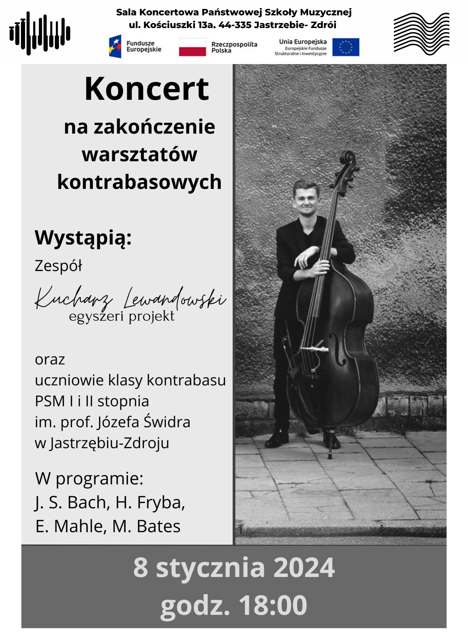 Zwieńczeniem warsztatów kontrabasowych, które odbyły się 8 stycznia 2024 r. był wieczorny koncert, na którym wystąpili uczniowie klasy kontrabasu Pana Piotra Kucharza: Nadia Pawłuszek, Anastazja Torz, Julia Witkowska, Marta Pawlik i Jan Kolankowski oraz nauczyciele: prowadzący warsztaty Dawid Lewandowski (kontrabas), Kamil Wolner (puzon) i Piotr Kucharz (akompaniament, kontrabas i gitara basowa).