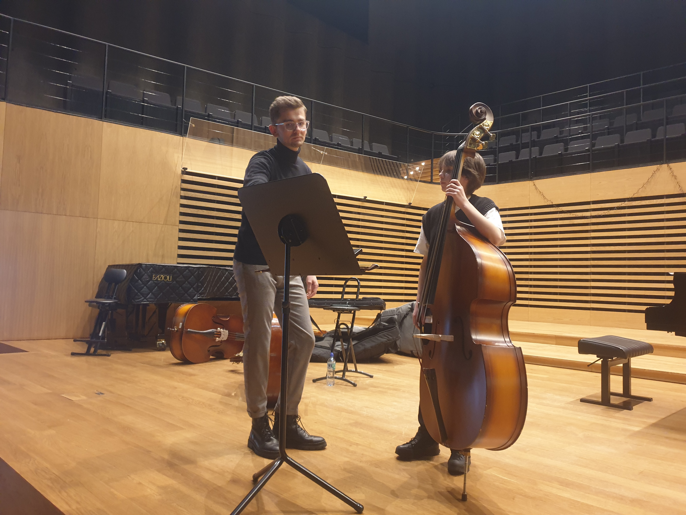 Prowadzący warsztaty mgr Dawid Lewandowski swoim entuzjazmem i pozytywną motywacją pomagał młodym kontrabasistom odkrywać piękno ukryte w tym najmłodszym, choć największym przedstawicielu instrumentów smyczkowych.