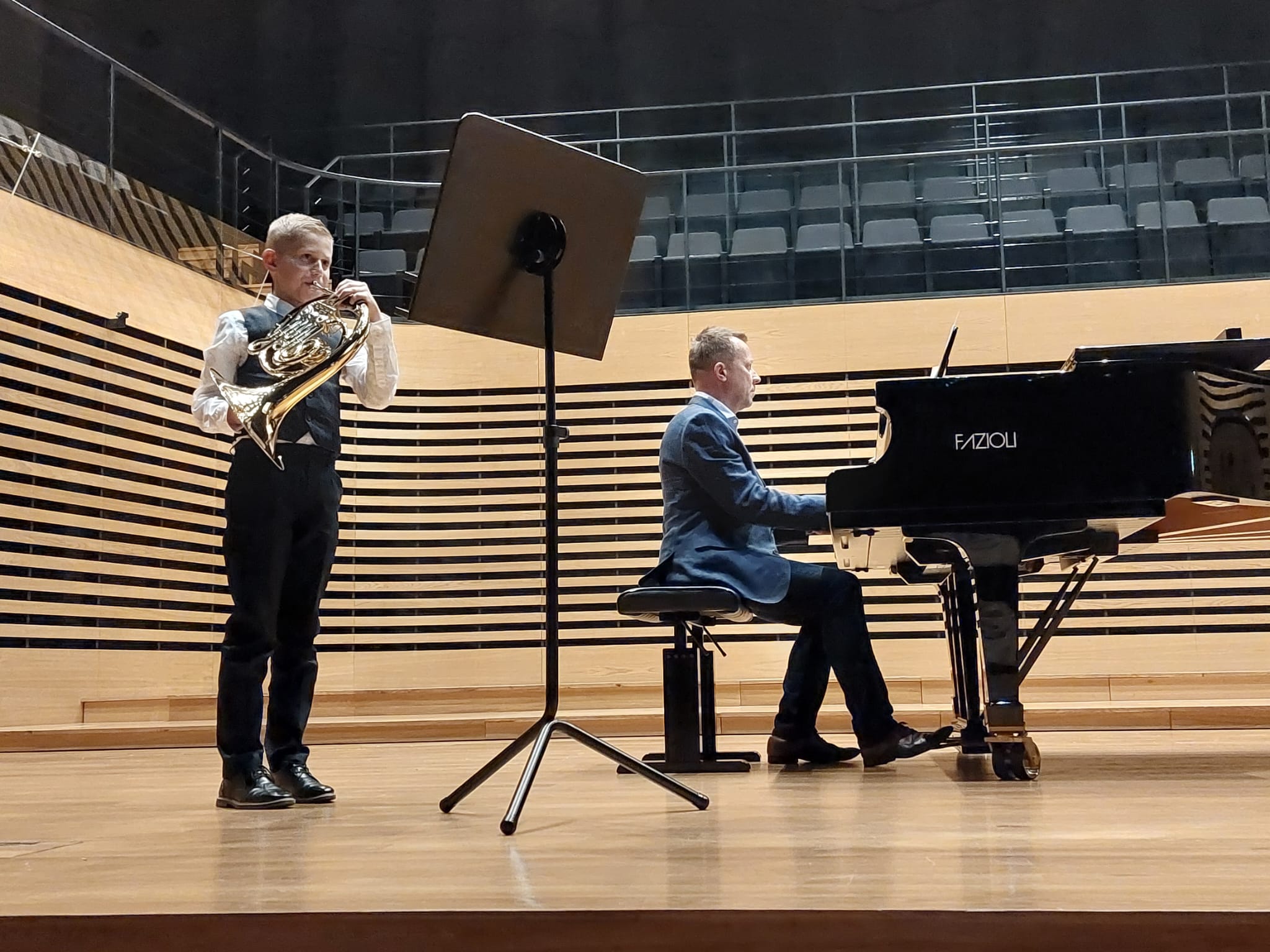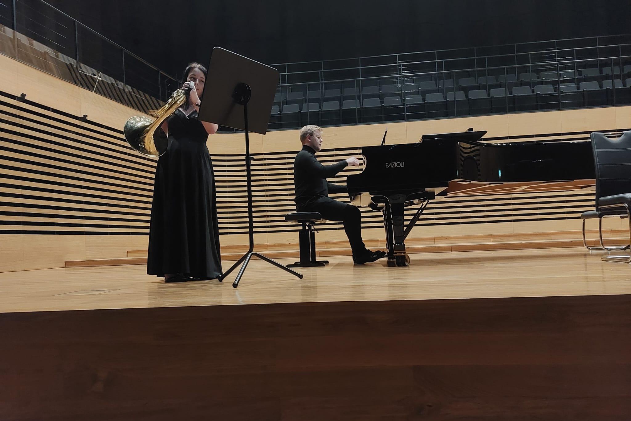 Uczniom akompaniowali: Pan Tomasz Pala oraz Pan Jakub Stachura. Aby dodać odwagi najmłodszemu waltorniście, na fortepianie towarzyszył mu nauczyciel.