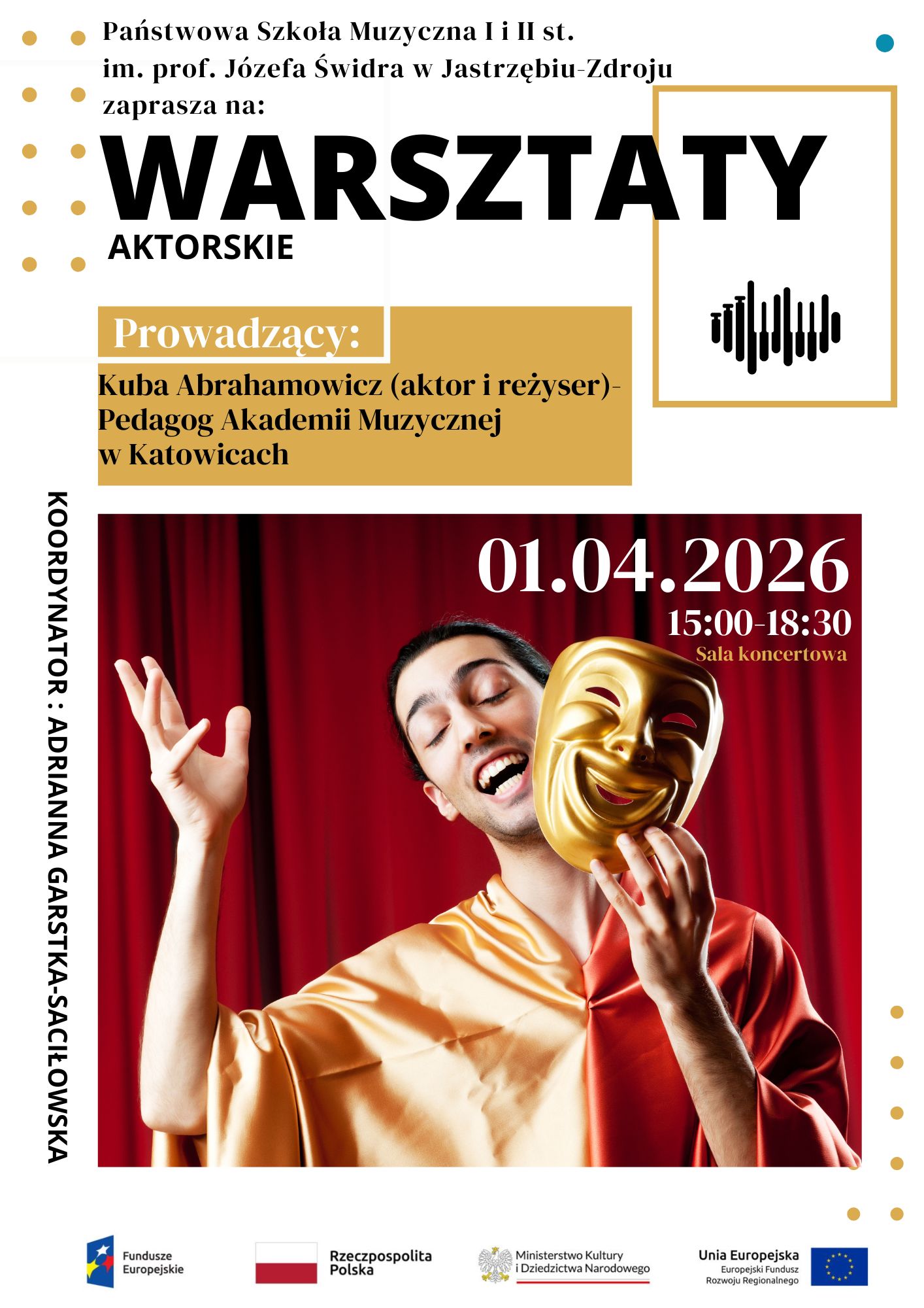 Zapraszamy na Warsztaty aktorskie - prowadzący Kuba Abrahamowicz Pedagog Akademii Muzycznej w Katowicach, które odbędą się 1 kwietnia 2026 r. o godzinie 15:30 do 18.30 w Sali koncertowej Szkoły Muzycznej w Jastrzębiu-Zdroju. Wstęp wolny.