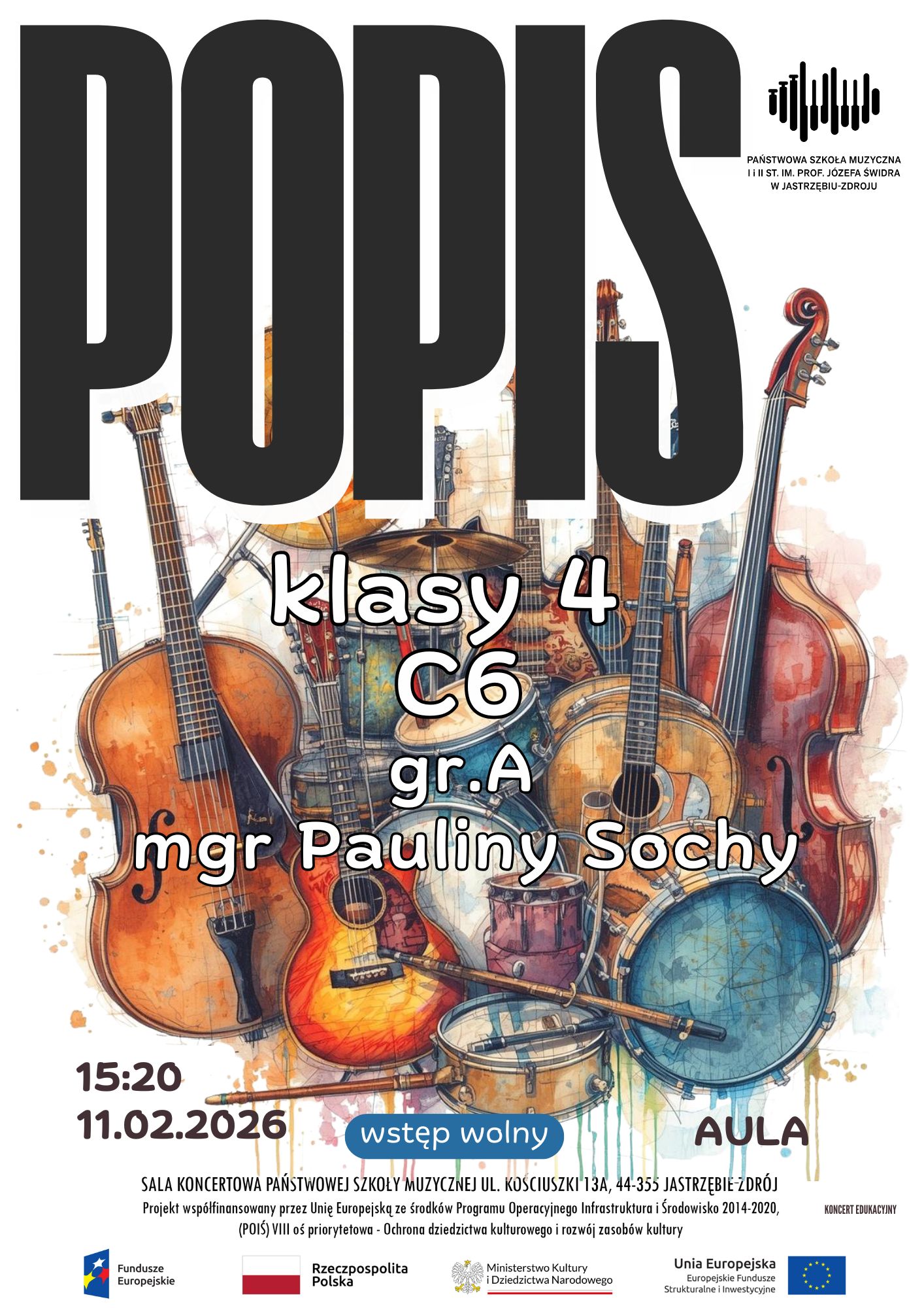 Zapraszamy na Popis klasy IV C6, gr. A mgr Pauliny Sochy, który odbędzie się 11 lutego 2026 r. o godzinie 15:20 w Auli Szkoły Muzycznej w Jastrzębiu-Zdroju. Wstęp wolny.