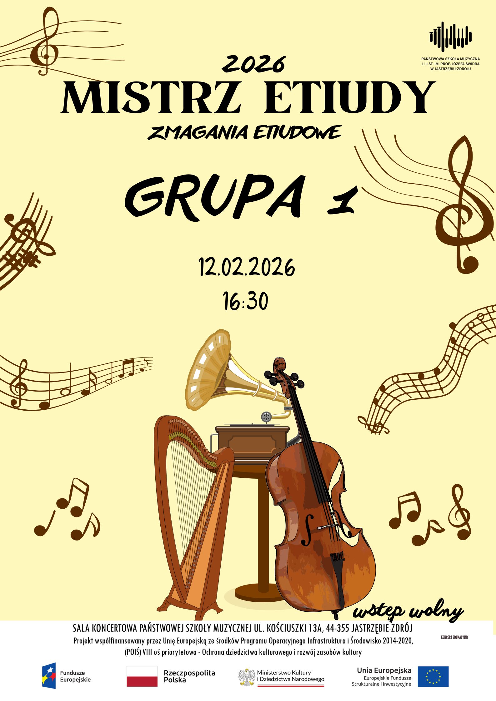 Zapraszamy na Zmagania Etiudowe grupy 1, które odbędą się 12 lutego 2026 r. o godzinie 16:30 w Sali koncertowej Szkoły Muzycznej w Jastrzębiu-Zdroju. Wstęp wolny.