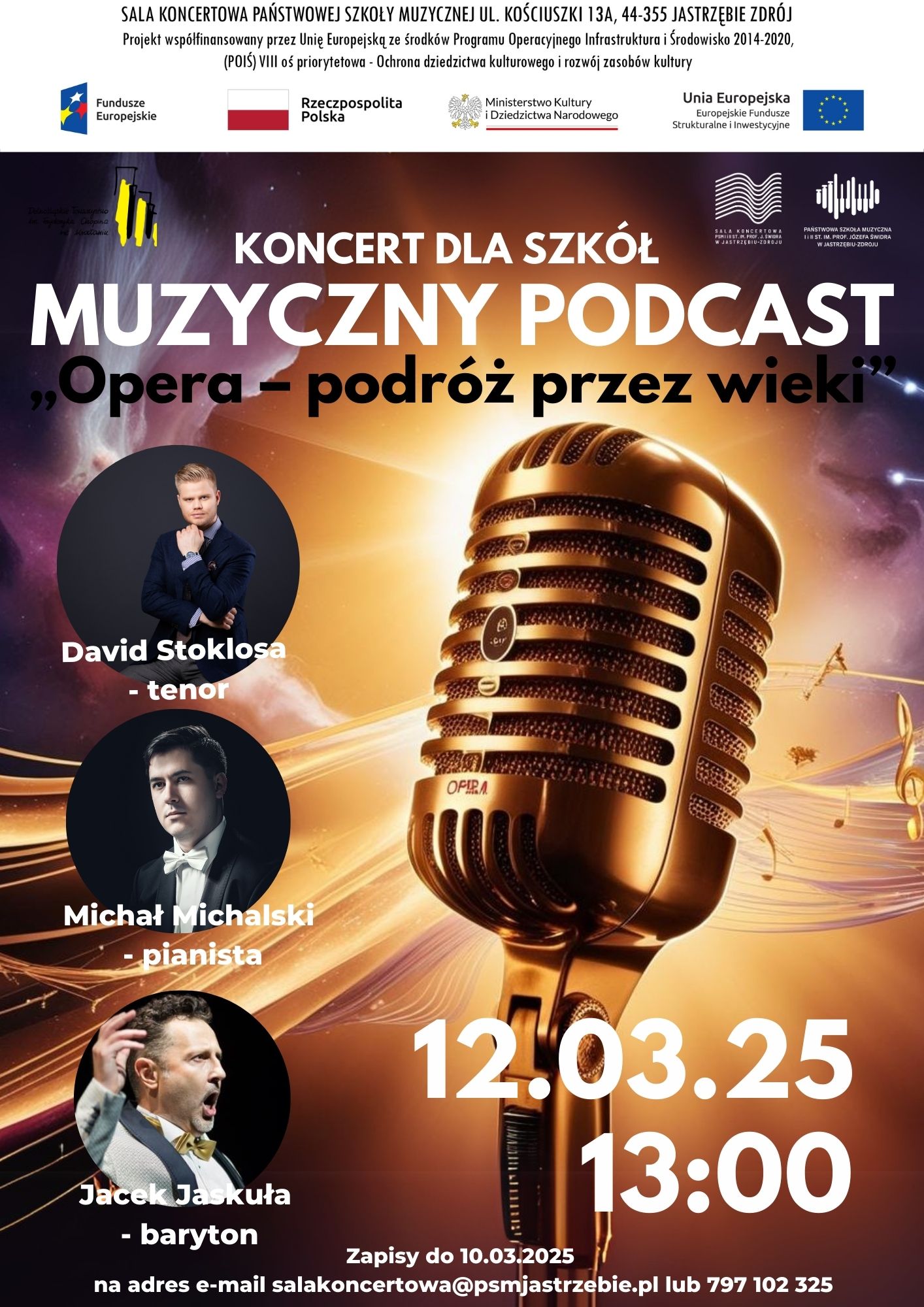Serdecznie zapraszamy uczniów szkół (od klasy 6 podstawówki ) na wyjątkowy koncert „Muzyczny Podcast: Opera – podróż przez wieki”, który odbędzie się 12 marca 2025 r. o godz. 13:00 w Sali Koncertowej Państwowej Szkoły Muzycznej w Jastrzębiu-Zdroju. Wstęp na koncert jest bezpłatny.