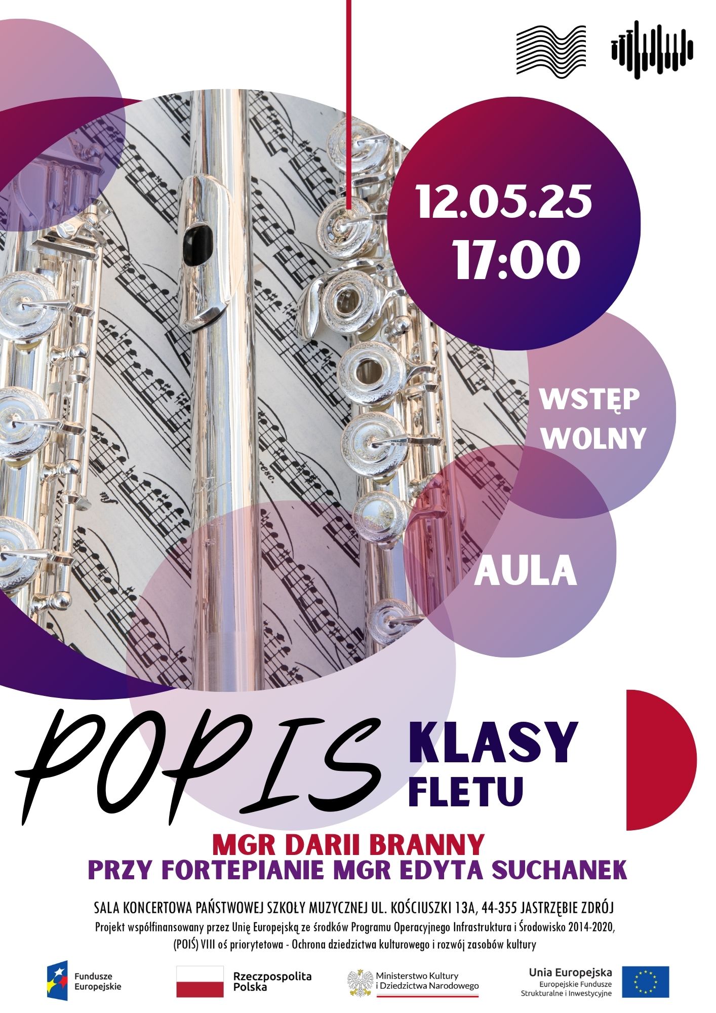 Zapraszamy na Popis klasy fletu mgr Darii Branny, który odbędzie się 12 maja 2025 r. o godzinie 17:00 w Auli Szkoły Muzycznej w Jastrzębiu-Zdroju. Wstęp wolny.