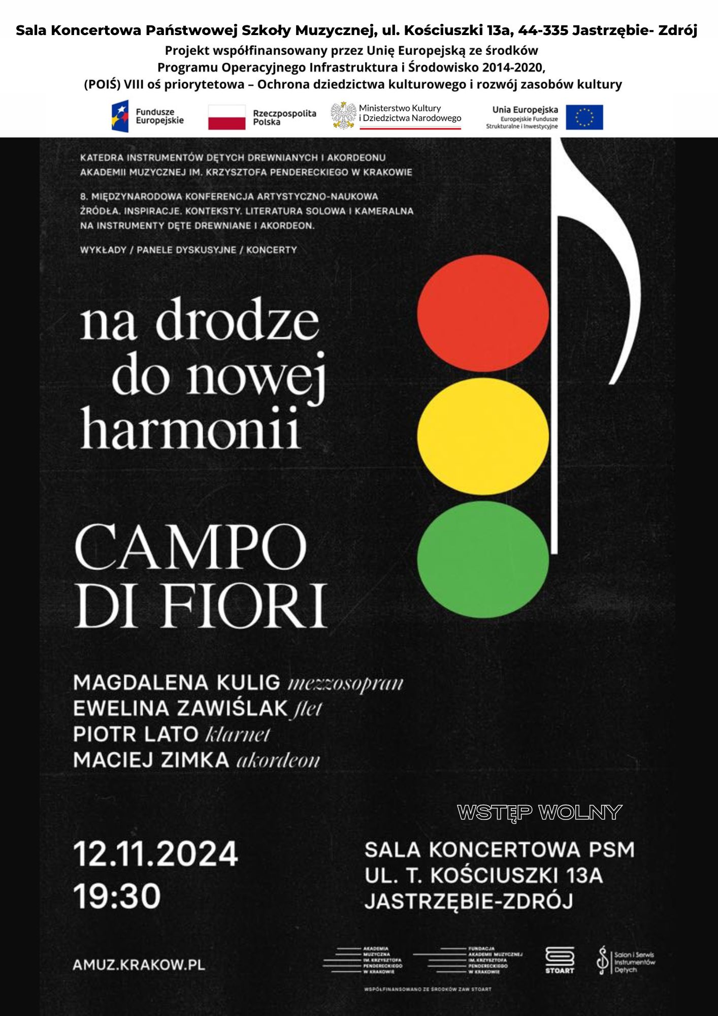 Zapraszamy na Koncert Campo di Fiori, który odbędzie się 12 listopada 2024 r. o godzinie 19:30 w sali koncertowej Szkoły Muzycznej w Jastrzębiu-Zdroju. Wstęp wolny.