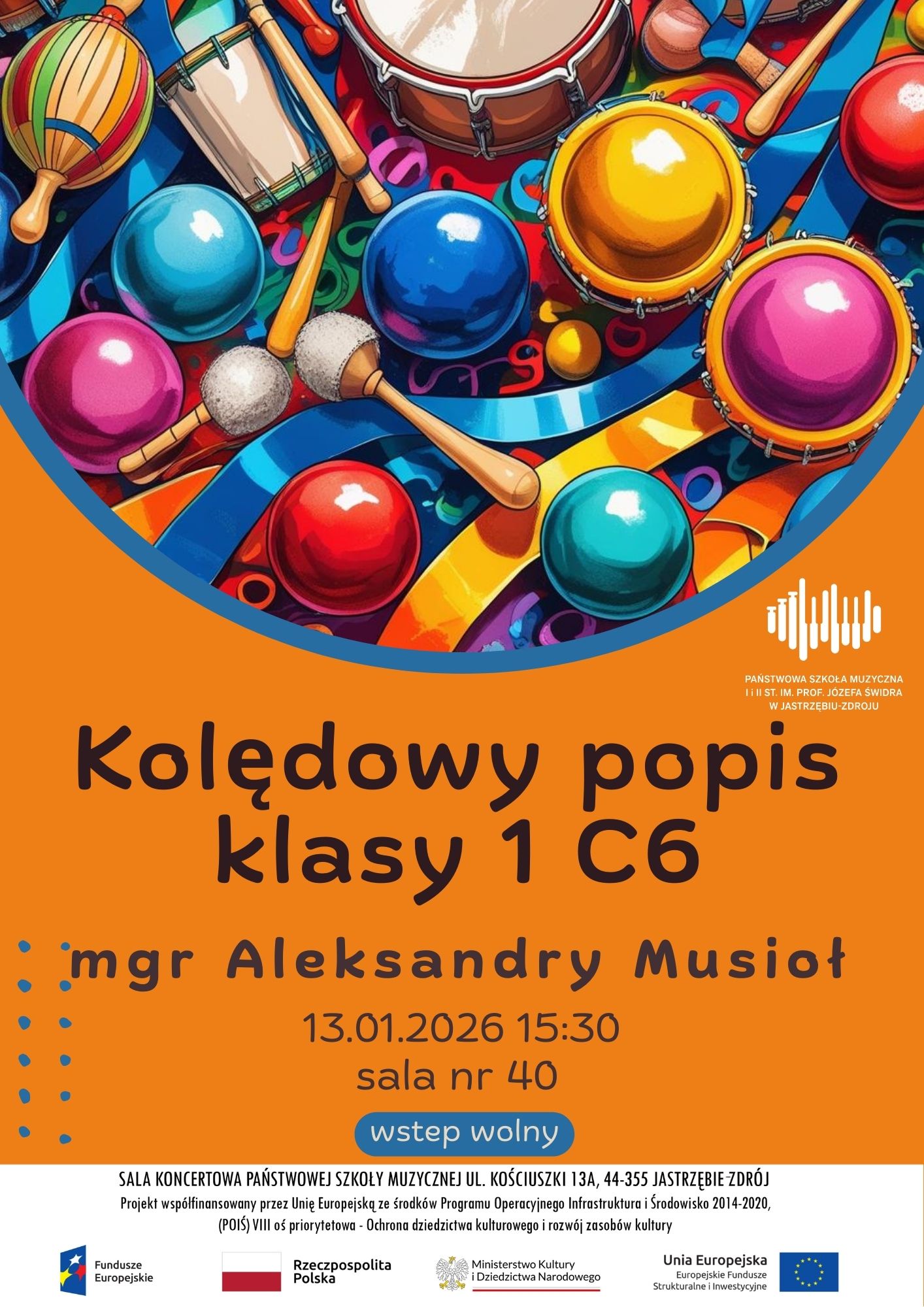Zapraszamy na Popis klasy 1 C6, mgr Aleksandry Musioł, który odbędzie się 13 stycznia 2026 r. o godzinie 15:30 w sali nr 40 Szkoły Muzycznej w Jastrzębiu-Zdroju. Wstęp wolny.