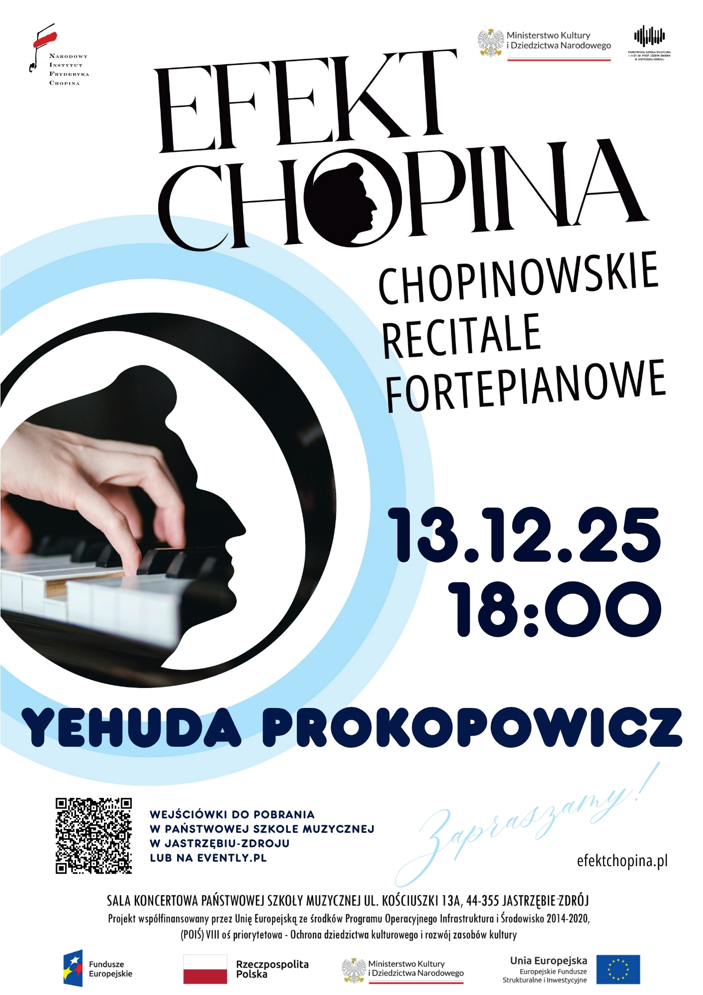Zapraszamy na Chopinowski Recital fortepianowy Yehudy Prokopowicza, który odbędzie się 13 grudnia 2025 r. o godzinie 18:00 w Sali koncertowej Szkoły Muzycznej w Jastrzębiu-Zdroju. Darmowe wejściówki do pobrania w Szkole Muzycznej w Jastrzębiu-Zdroju i na EVENTLY.PL