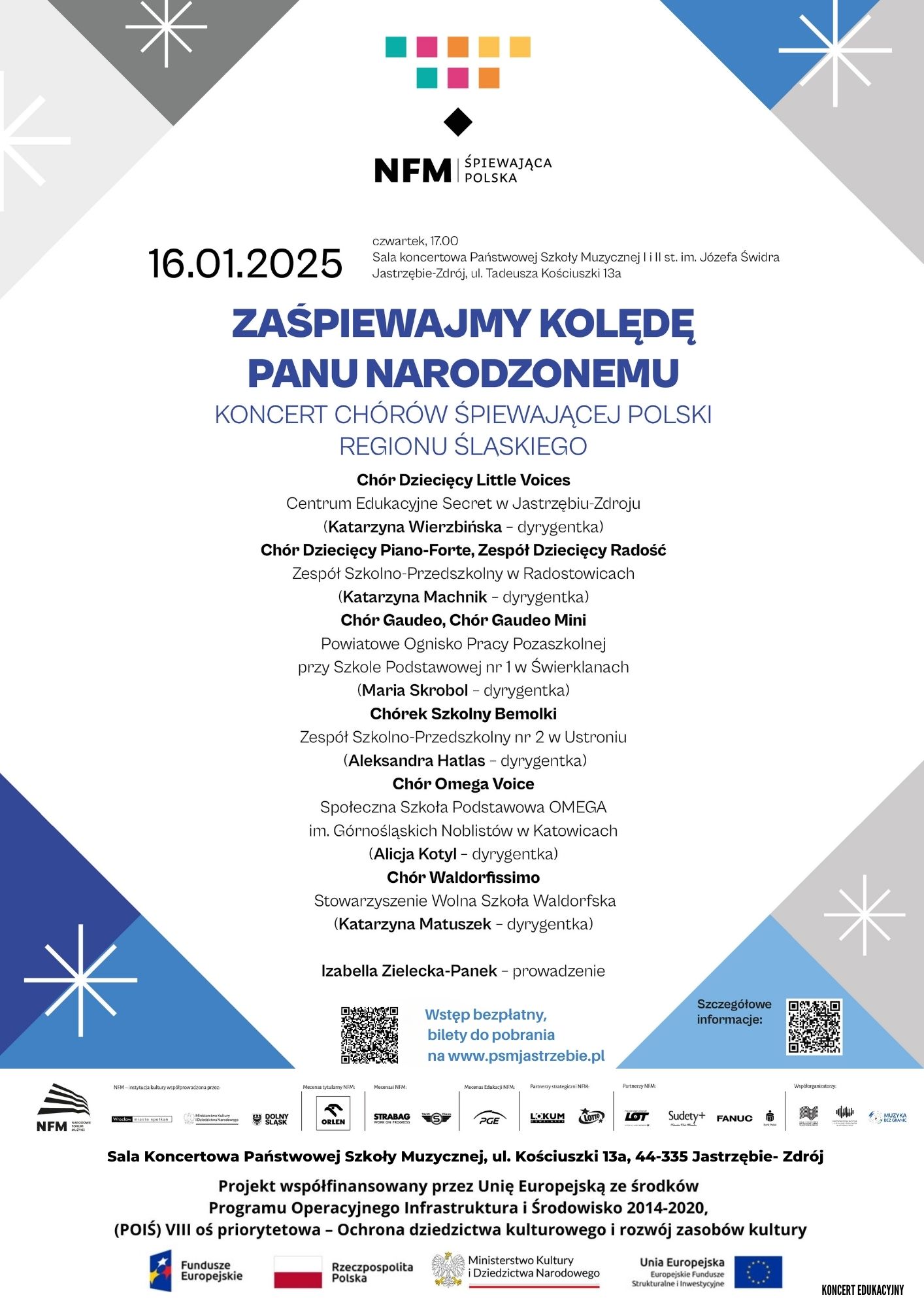 Zapraszamy do udziału w koncercie ZAŚPIEWAJMY KOLĘDĘ PANU NARODZONEMU – region śląski Śpiewającej Polski kolęduje, który odbędzie się 16.01.2025 r. o godzinie 17:00 w Sali koncertowej Szkoły Muzycznej w Jastrzębiu-Zdroju. Darmowe wejściówki do pobrania w Szkole Muzycznej w Jastrzębiu-Zdroju i na EVENTLY.PL