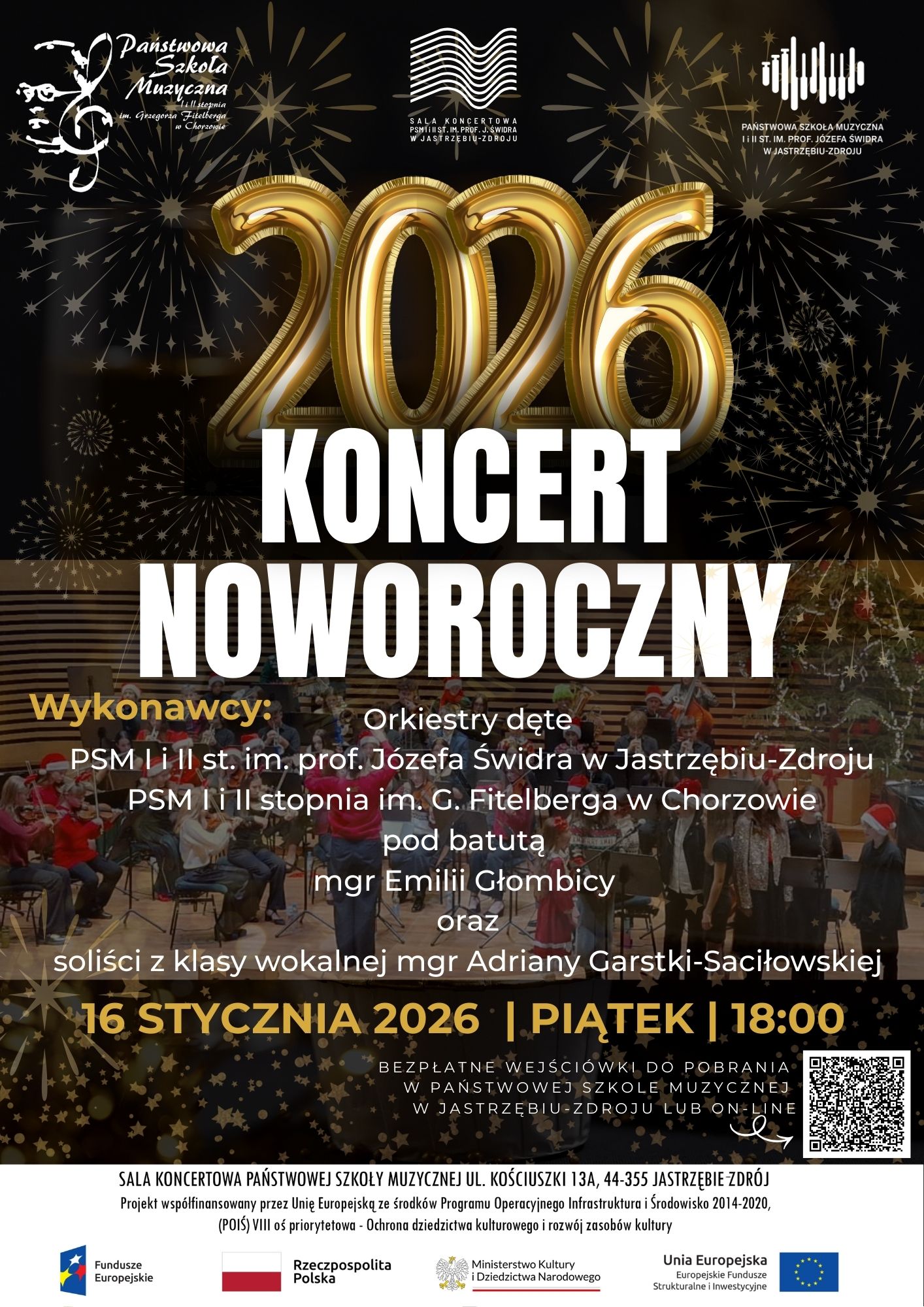 Zapraszamy na Koncert Noworoczny, który odbędzie się 16 stycznia 2026 r. o godzinie 18:00 w Sali Koncertowej Szkoły Muzycznej w Jastrzębiu-Zdroju. Darmowe wejściówki do pobrania w Szkole Muzycznej w Jastrzębiu-Zdroju i na EVENTLY.PL