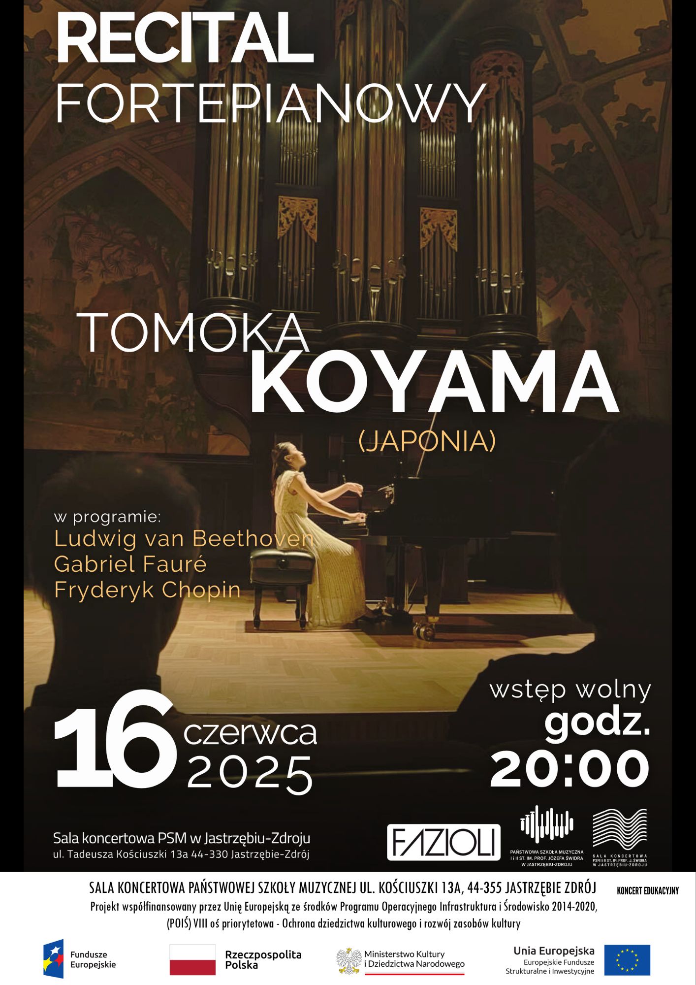 Zapraszamy na Recital Fortepianowy TOMOKA KOYAMA, który odbędzie się 16 czerwca 2025 r. o godzinie 20:00 w Sali koncertowej Szkoły Muzycznej w Jastrzębiu-Zdroju. Wstęp wolny.