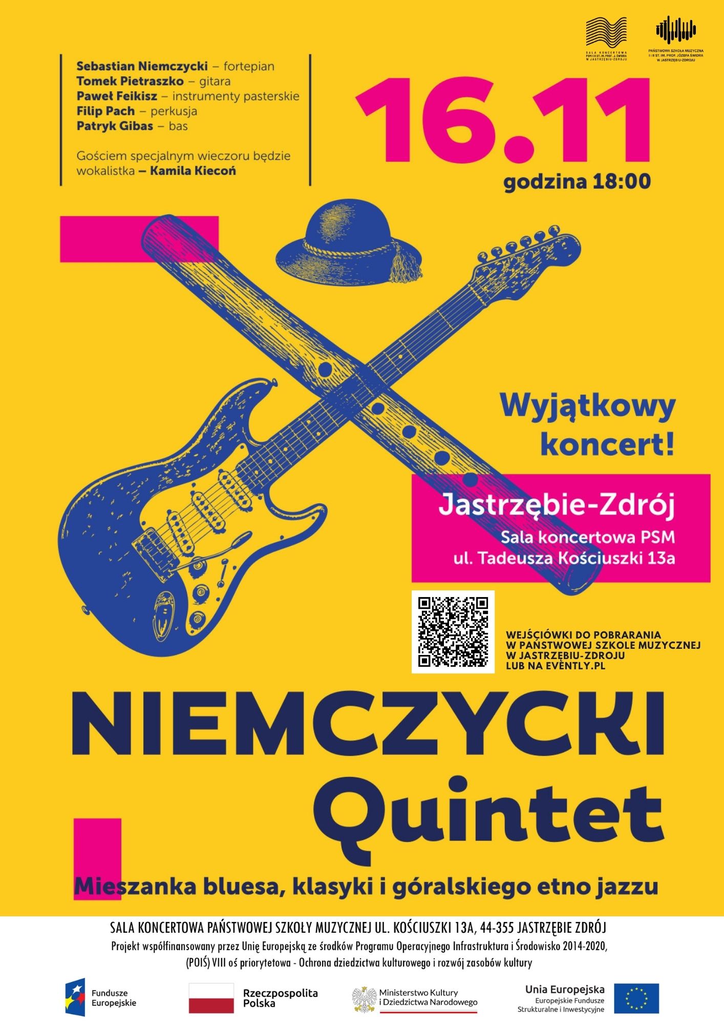 Zapraszamy na Koncert Niemczycki Quintet, który odbędzie się 16 listopada 2025 r. o godzinie 18:00 w Sali Koncertowej Szkoły Muzycznej w Jastrzębiu-Zdroju. Bezpłatne wejściówki do pobrania w Szkole Muzycznej w Jastrzębiu-Zdroju i na EVENTLY.PL