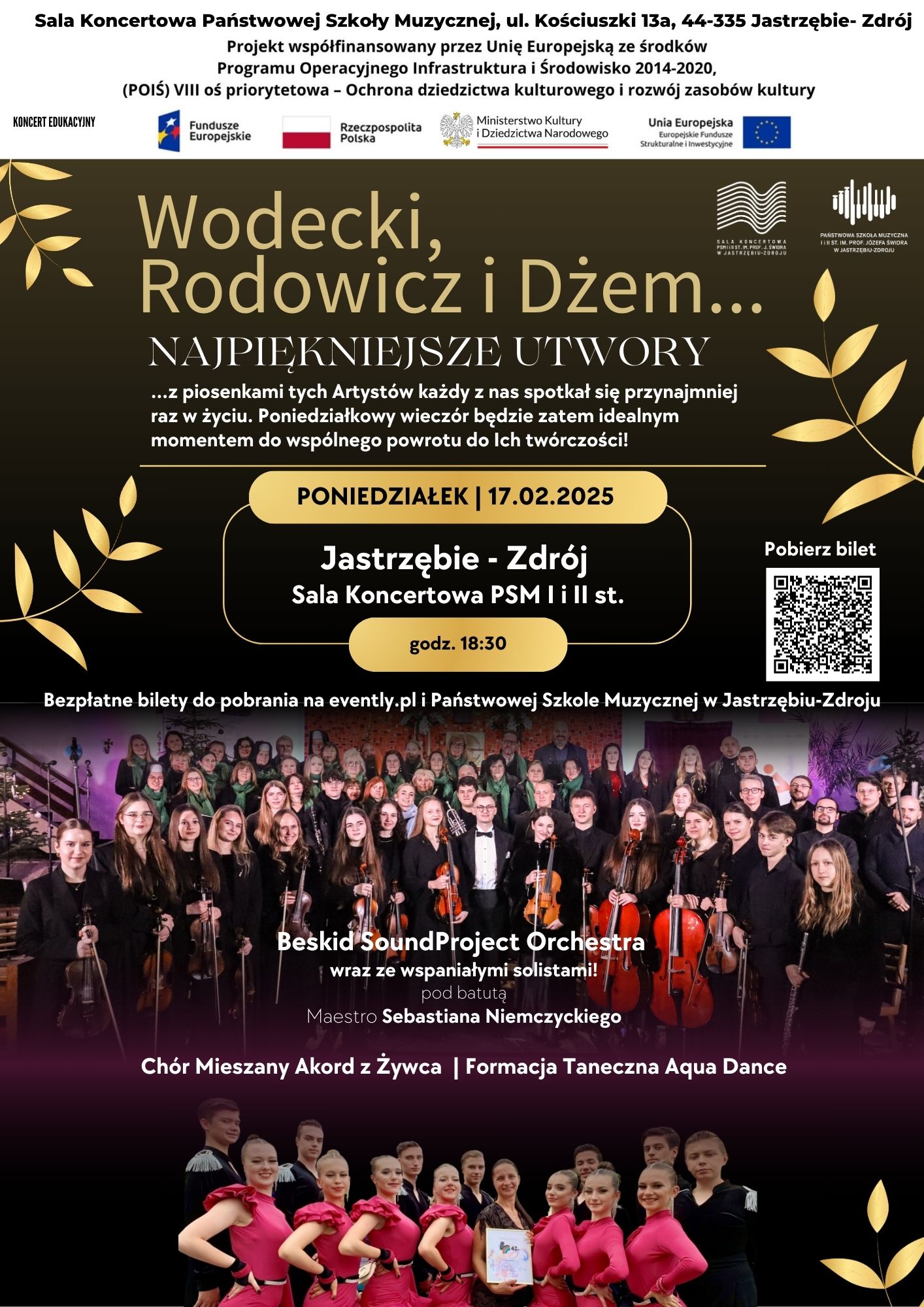 Zapraszamy na Koncert Wodecki, Rodowicz i Dżem gdzie będzie można usłyszeć najpiękniejsze utwory. Koncert odbędzie się odbędzie się 17 lutego 2025 r. o godzinie 18:30 w Sali koncertowej Szkoły Muzycznej w Jastrzębiu-Zdroju. Bezpłatne wejściówki do pobrania w Szkole Muzycznej w Jastrzębiu-Zdroju i na EVENTLY.PL