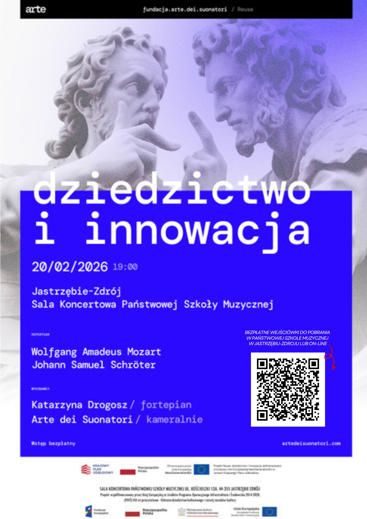 Zapraszamy na Koncert Dziedzictwo i innowacja, który odbędzie się 20 lutego 2026 r. o godzinie 19:00 w Sali koncertowej Szkoły Muzycznej w Jastrzębiu-Zdroju. Darmowe wejściówki do pobrania w Szkole Muzycznej w Jastrzębiu-Zdroju i na EVENTLY.PL