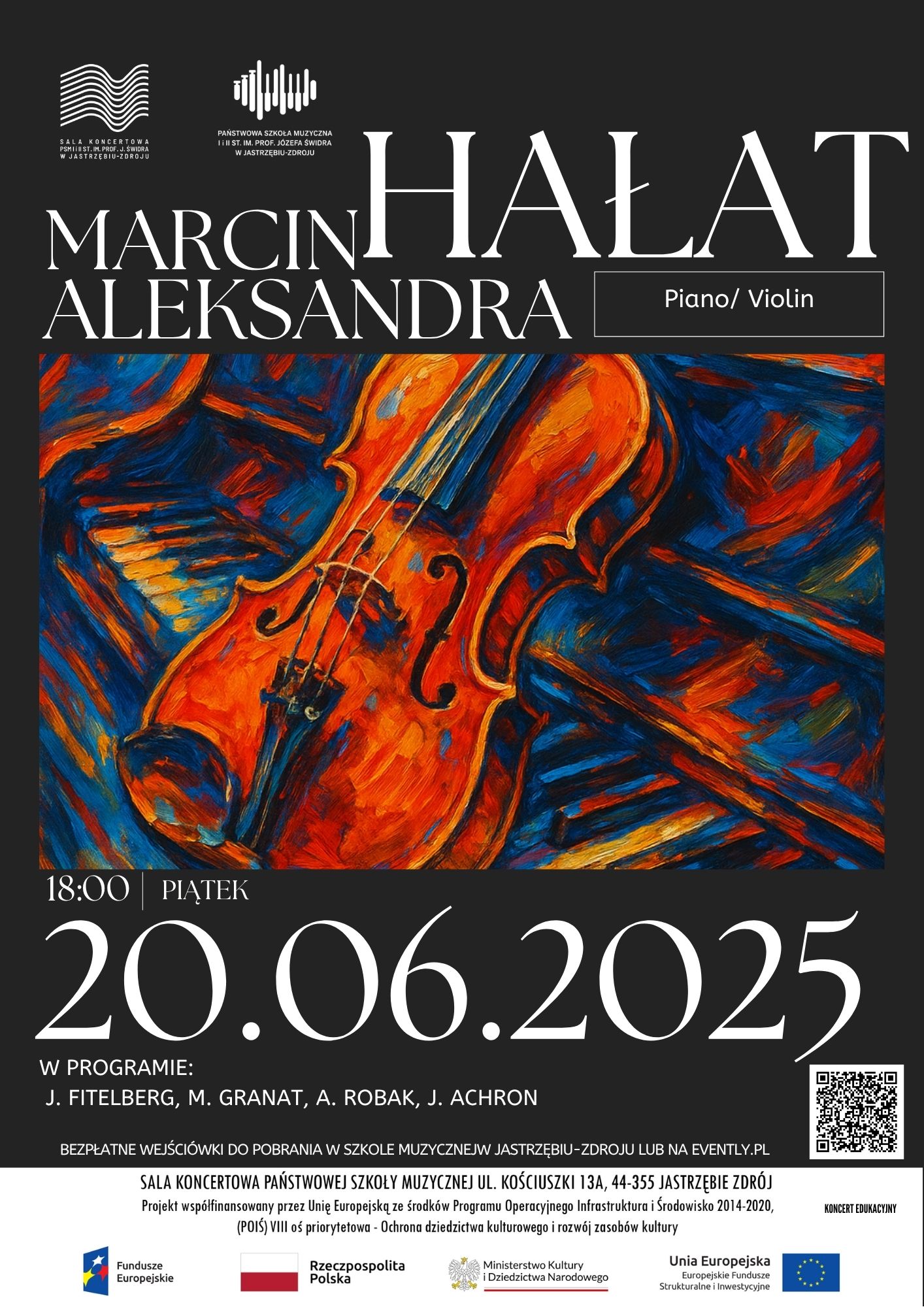 Zapraszamy na Koncert Aleksandry i Marcina Hałat, który odbędzie się 20 czerwca 2025 r. o godzinie 18:00 w Sali koncertowej Szkoły Muzycznej w Jastrzębiu-Zdroju. Darmowe wejściówki do pobrania w Szkole Muzycznej w Jastrzębiu-Zdroju i na EVENTLY.PL