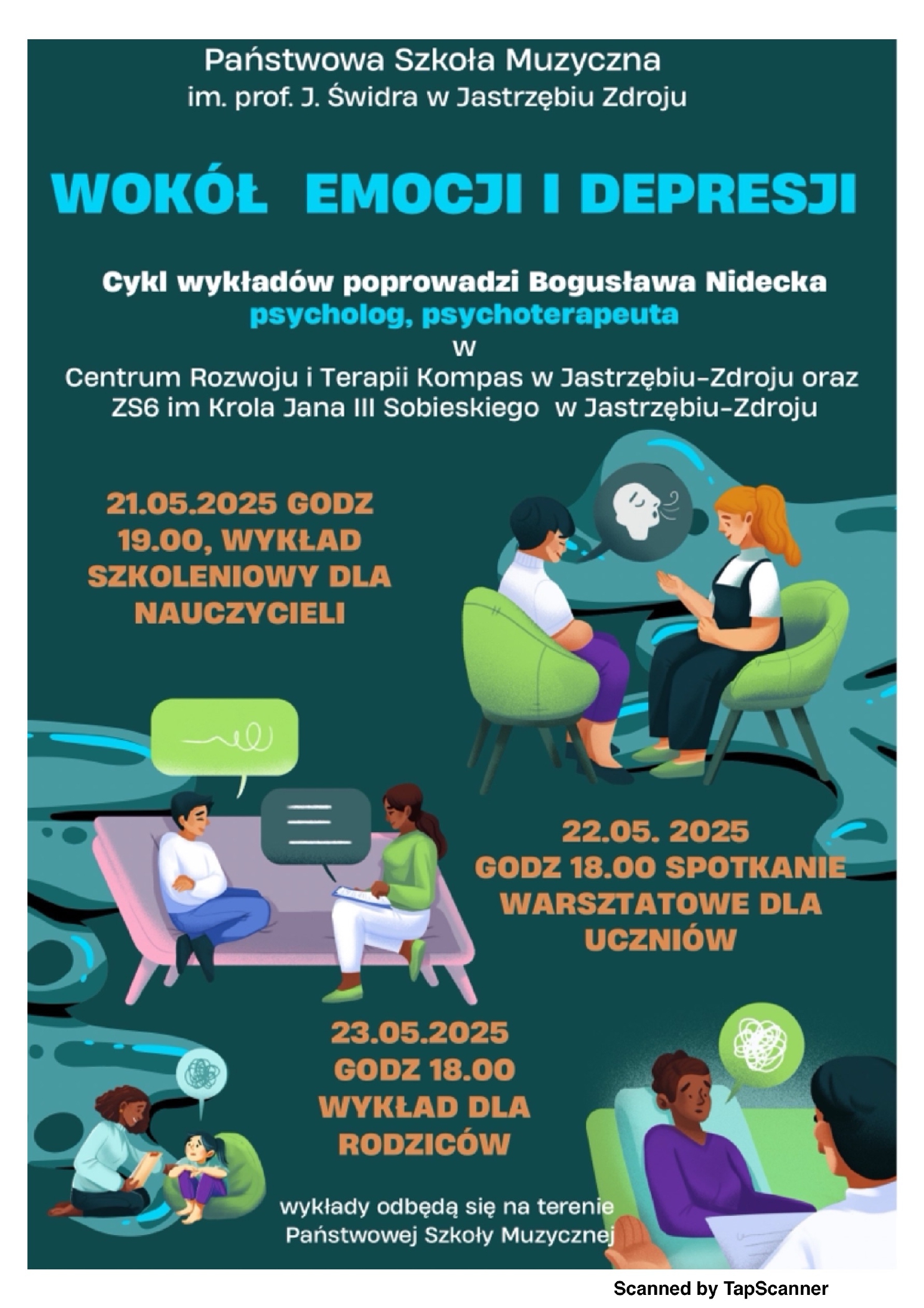 Serdecznie zapraszamy na cykl wykładów pt. "Wokół emocji i depresji", które poprowadzi Bogusława Nidecka psycholog, psychoterapeuta. Warsztaty są dedykowane dla nauczycieli, uczniów oraz rodziców. Zapraszamy w dniach 21-23.05.2025 według godzin na plakacie.