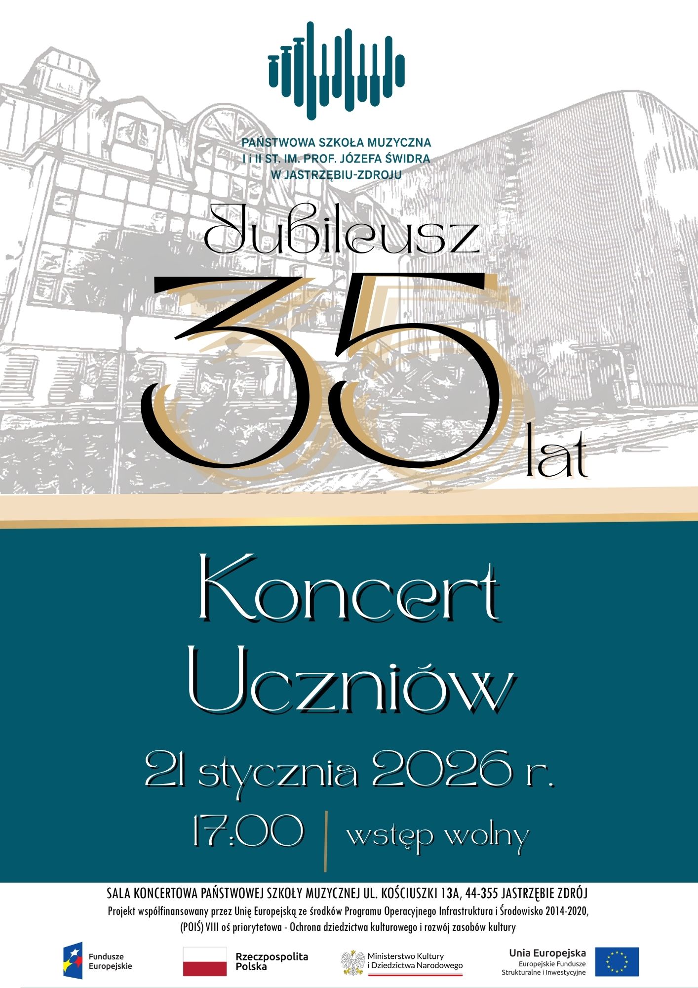 Zapraszamy na Koncert Uczniów naszej Szkoły z okazji Jubileuszu 35 lat, który odbędzie się 21 stycznia 2026 r. o godzinie 17:00 w Sali koncertowej Szkoły Muzycznej w Jastrzębiu-Zdroju. Wstęp wolny.