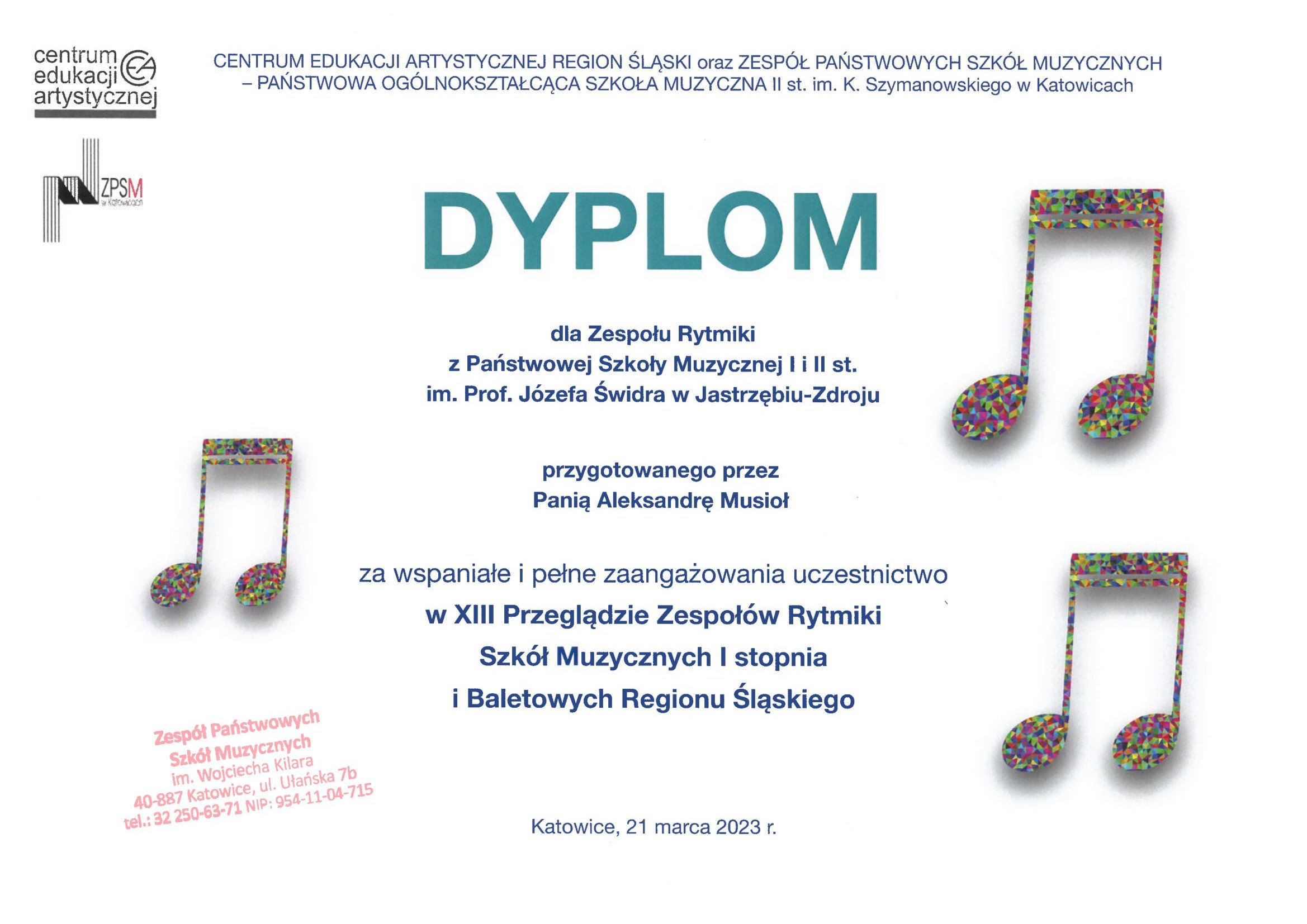 21 marca 2023 r. w Zespole Państwowych Szkół Muzycznych im. Wojciecha Kilara w Katowicach odbył się XIII Przegląd Zespołów Rytmiki Szkół Muzycznych I stopnia i Baletowych Regionu Śląskiego.