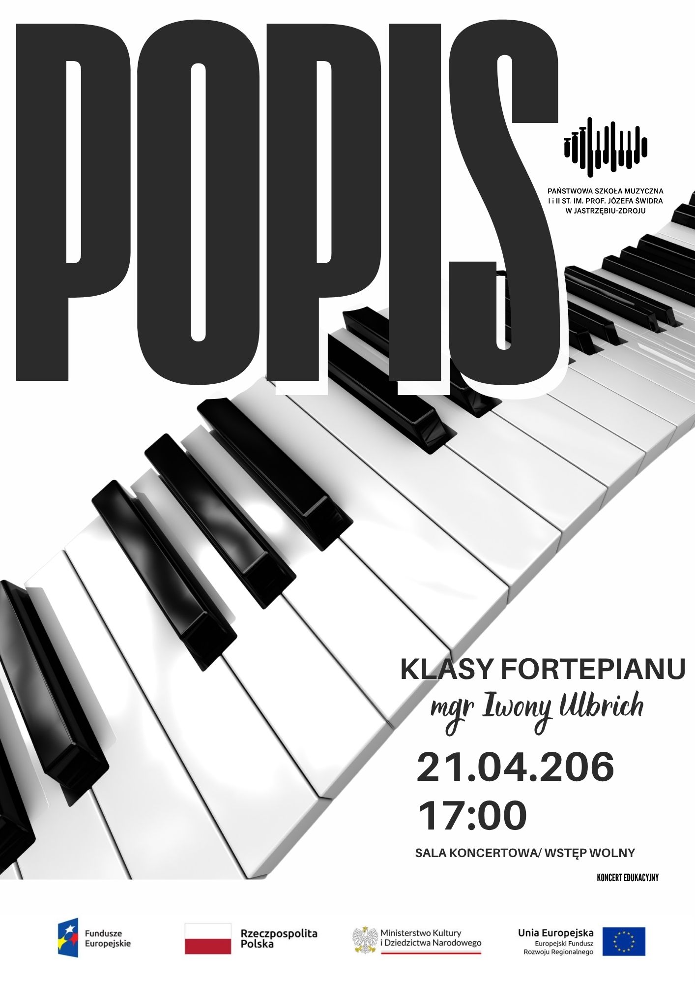 Zapraszamy na Popis klasy fortepianu mgr Iwony Ulbrich, który odbędzie się 11 kwietnia 2026 r. o godzinie 17:00 w Sali koncertowej Szkoły Muzycznej w Jastrzębiu-Zdroju. Wstęp wolny.