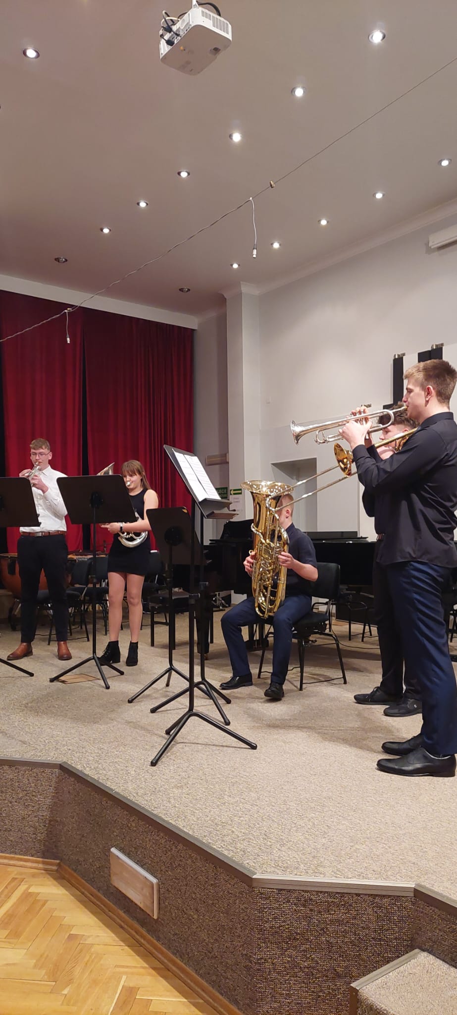 KWINTET DĘTY BLASZANY: Adam Gawron – trąbka, Patryk Kuroczik - trąbka, Anna Seńkowska - sakshorn, Mateusz Kos - puzon, Bartosz Misztal – tuba (przygotował mgr Adam Penkała)