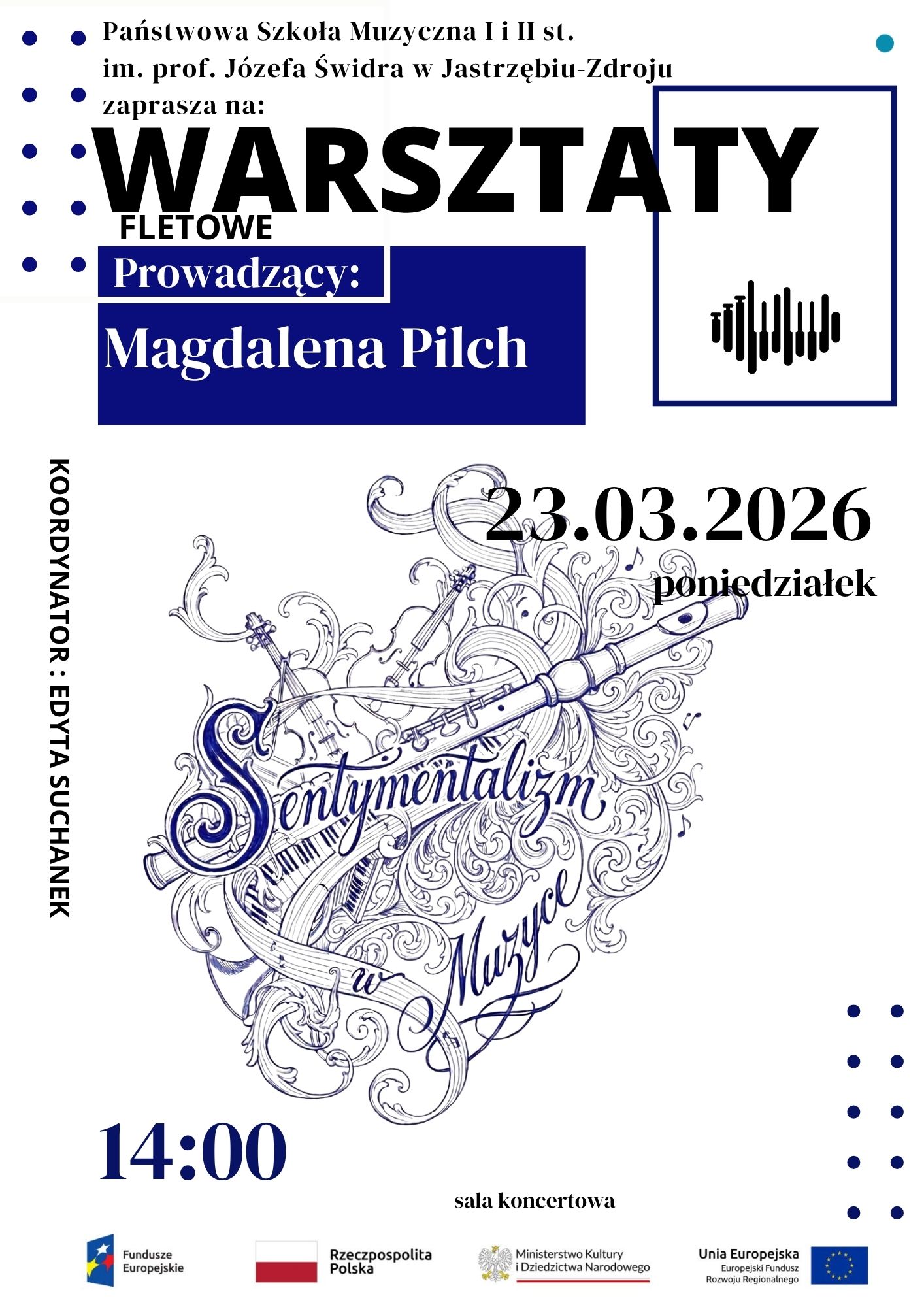 Zapraszamy na Warsztaty fletowe, które poprowadzi Magdalena Pilch - koordynator: Edyta Suchanek. Warsztaty odbędą się się 23 marca 2026 r. o godzinie 14:00 w Sali koncertowej Szkoły Muzycznej w Jastrzębiu-Zdroju. Wstęp wolny.