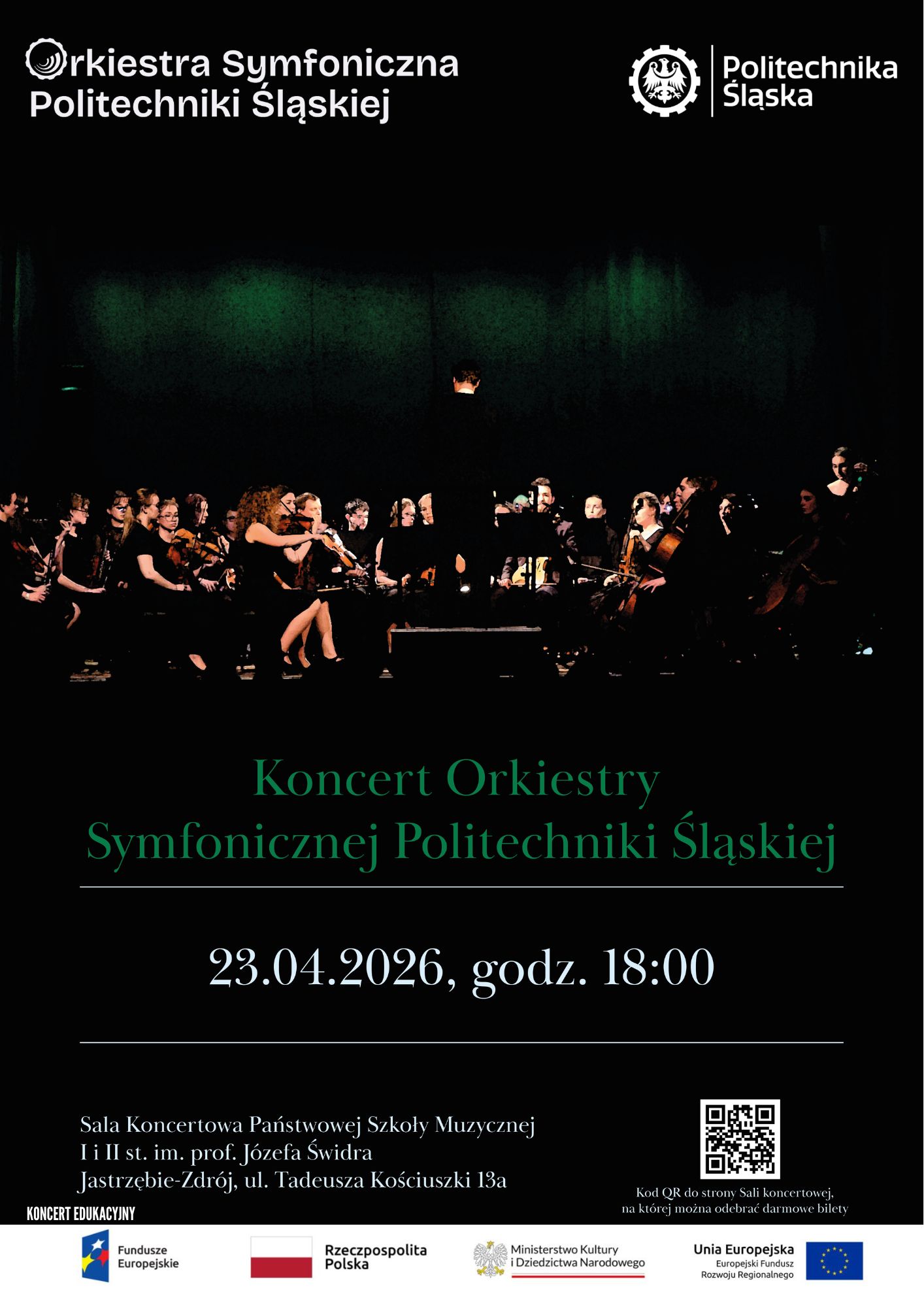 Zapraszamy na Koncert Orkiestry Symfonicznej Politechniki Śląskiej, który odbędzie się 23 kwietnia 2026 r. o godzinie 18:00 w Sali koncertowej Szkoły Muzycznej w Jastrzębiu-Zdroju. Darmowe wejściówki do pobrania w Szkole Muzycznej w Jastrzębiu-Zdroju i na EVENEA.PL