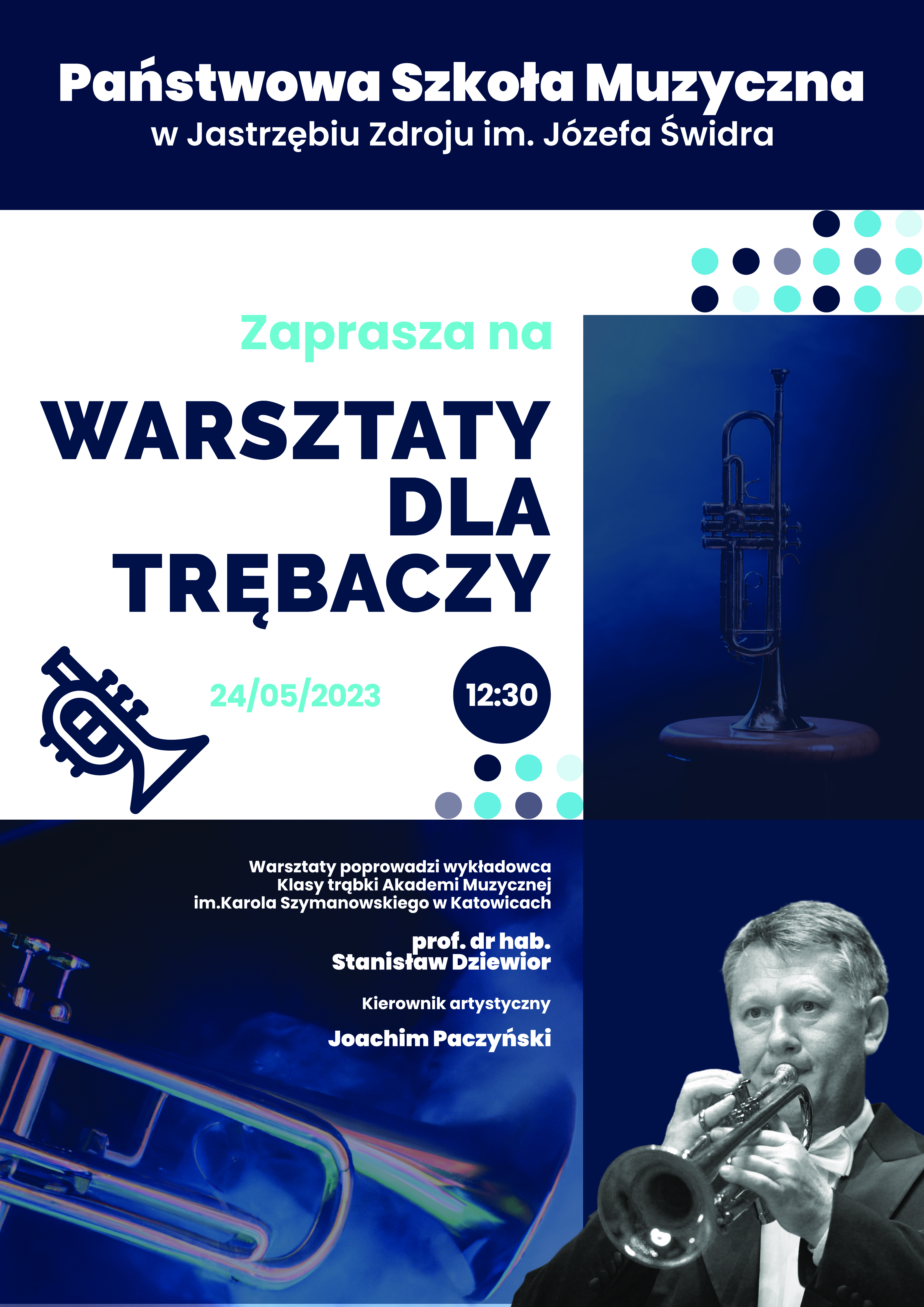 24 maja 2023 r. w naszej szkole w sali koncertowej odbyły się warsztaty dla trębaczy, które prowadził wykładowca klasy trąbki Akademii Muzycznej w Katowicach prof. dr hab. Stanisław Dziewior - pierwszy trębacz NOSPR w Katowicach.