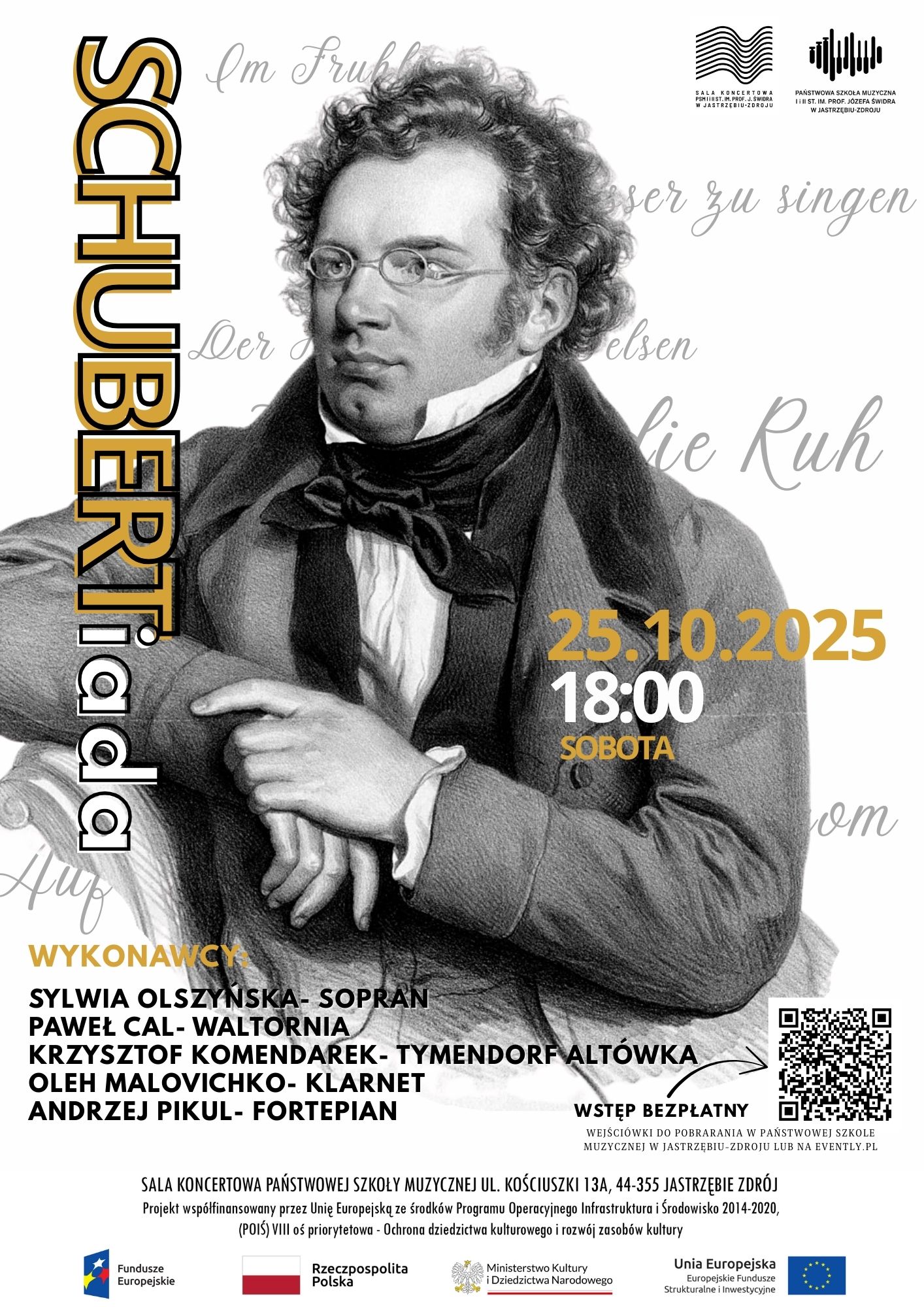 Zapraszamy na SCHUBERTiadę, która odbędzie się 25 października 2025 r. o godzinie 18:00 w Sali Koncertowej Szkoły Muzycznej w Jastrzębiu-Zdroju. Darmowe wejściówki do pobrania w Szkole Muzycznej w Jastrzębiu-Zdroju i na EVENTLY.PL