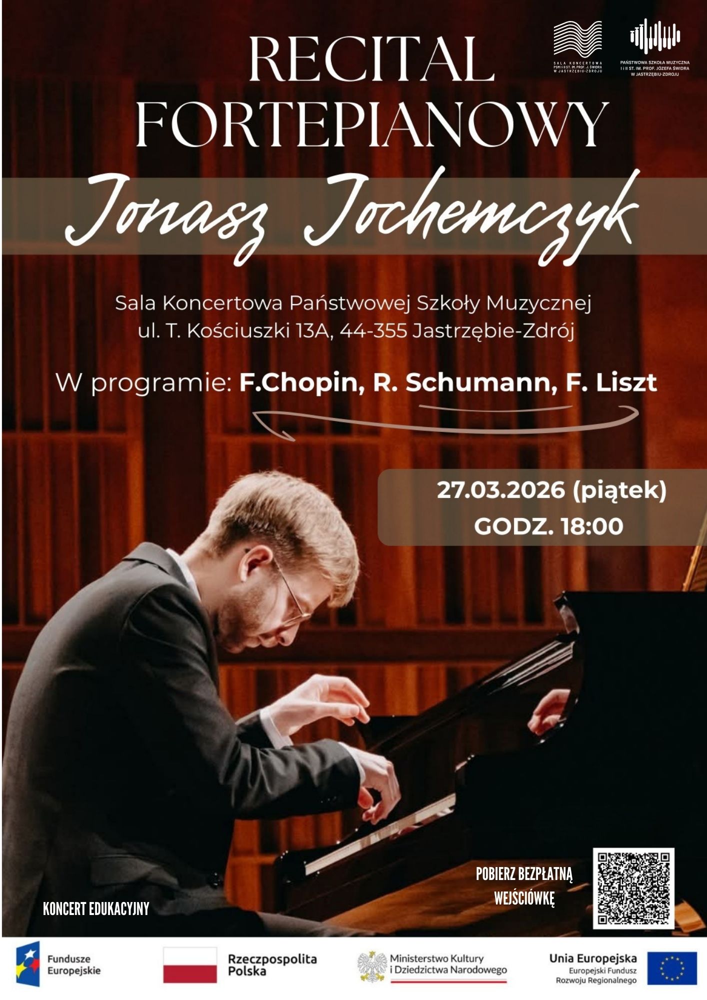 Zapraszamy na Recital fortepianowy Jonasza Jochemczyka, który odbędzie się 27 marca 2026 r. o godzinie 18:00 w Sali koncertowej Szkoły Muzycznej w Jastrzębiu-Zdroju. Bezpłatne wejściówki do pobrania w w Państwowej Szkole Muzycznej i on-line.