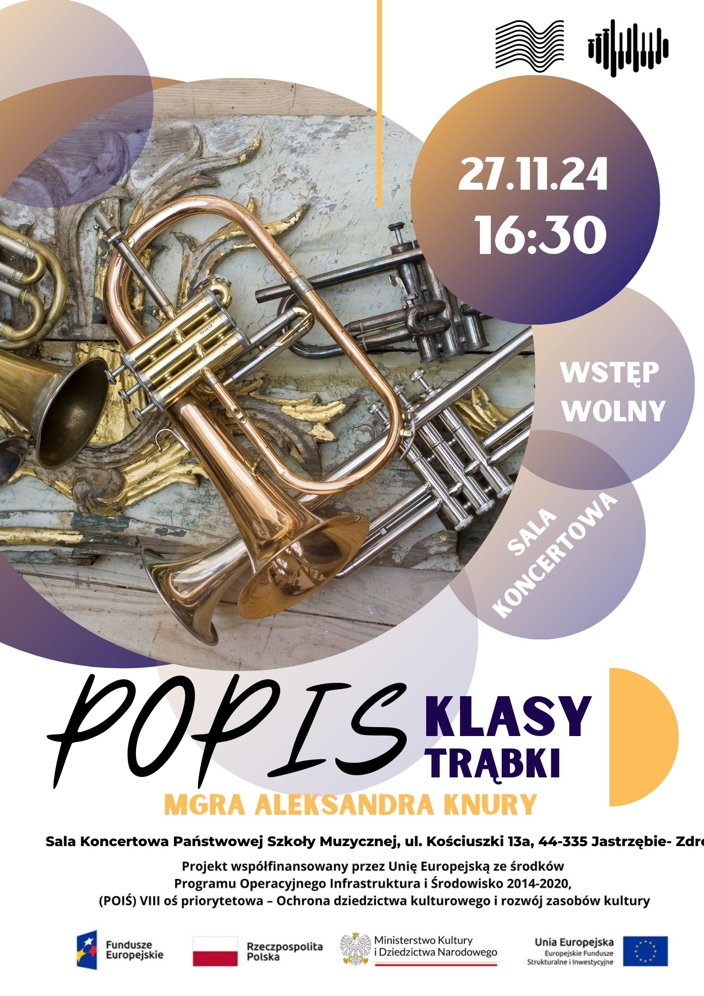 Zapraszamy na Popis klasy trąbki mgr Aleksandra Knury, który odbędzie się 27 listopada 2024 r. o godzinie 16:30 w sali koncertowej Szkoły Muzycznej w Jastrzębiu-Zdroju. Wstęp wolny.