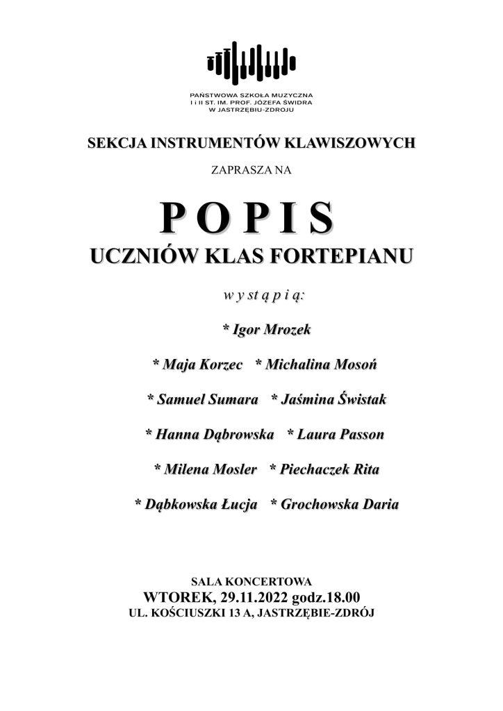 29.11.22 - Popis uczniów klas fortepianu 29.11.2022 29.11.22 - Popis klas fortepianu Popis uczniów klas fortepianu PSM I i II st. Zdjęcia (4) Pokaż zdjęcie 1 z galerii. Pokaż zdjęcie 2 z galerii. Pokaż zdjęcie 3 z galerii. Pokaż zdjęcie 4 z galerii.