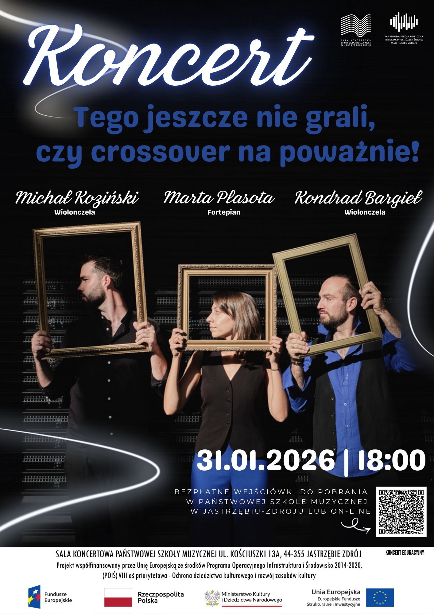 Zapraszamy na Koncert Tego jeszcze nie grali, czy crossover na poważnie- NOVE TRIO, który odbędzie się 31 stycznia 2026 r. o godzinie 18:00 w Sali koncertowej Szkoły Muzycznej w Jastrzębiu-Zdroju. Darmowe wejściówki do pobrania w Szkole Muzycznej w Jastrzębiu-Zdroju lub on-line.
