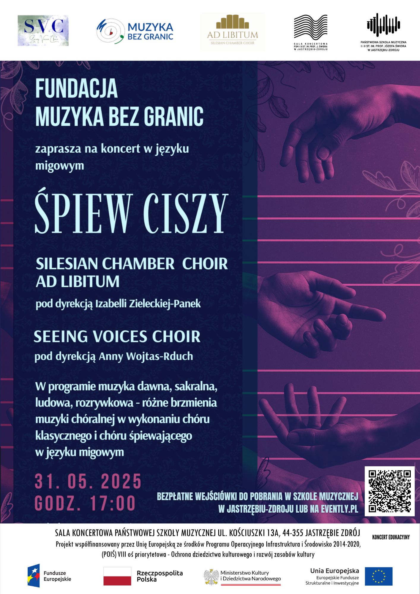 Fundacja Muzyka bez Granic zaprasza na Koncert w języku migowym "Śpiew ciszy", który odbędzie się 31 maja 2025 r. o godzinie 17:00 w sali koncertowej Szkoły Muzycznej w Jastrzębiu-Zdroju. Darmowe wejściówki do pobrania w Szkole Muzycznej w Jastrzębiu-Zdroju i na EVENTLY.PL