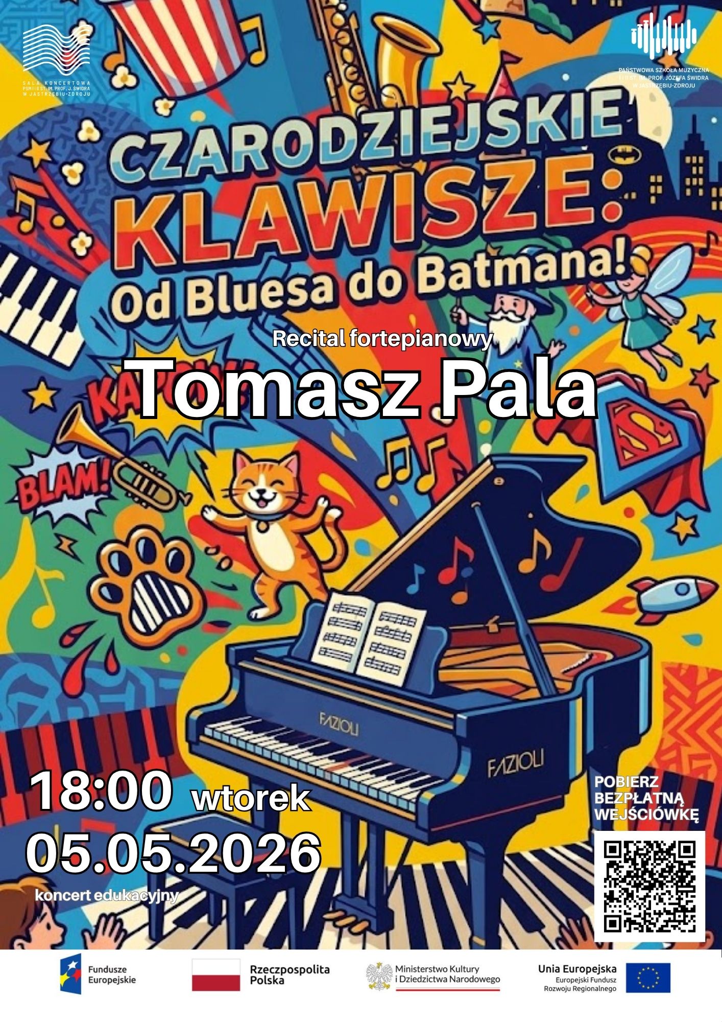 Zapraszamy na Recital Fortepianowy- Tomasz Pala „OD BLUESA DO BATMANA”, który odbędzie się 5 maja 2026 r. o godzinie 18:00 w Sali koncertowej Szkoły Muzycznej w Jastrzębiu-Zdroju. Bezpłatne wejściówki do pobrania w Szkole Muzycznej w Jastrzębiu-Zdroju i na EVENEA.PL