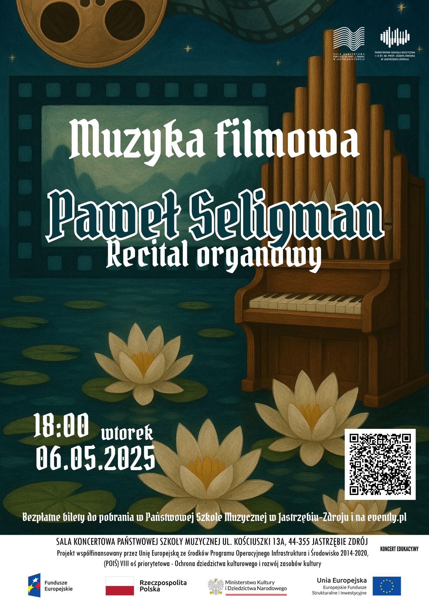 Zapraszamy na Recital organowy Pawła Seligmana, który odbędzie się 6 maja 2025 r. o godzinie 18:00 w sali koncertowej Szkoły Muzycznej w Jastrzębiu-Zdroju. Bezpłatne wejściówki do pobrania w Państwowej Szkole Muzycznej i na evently.pl