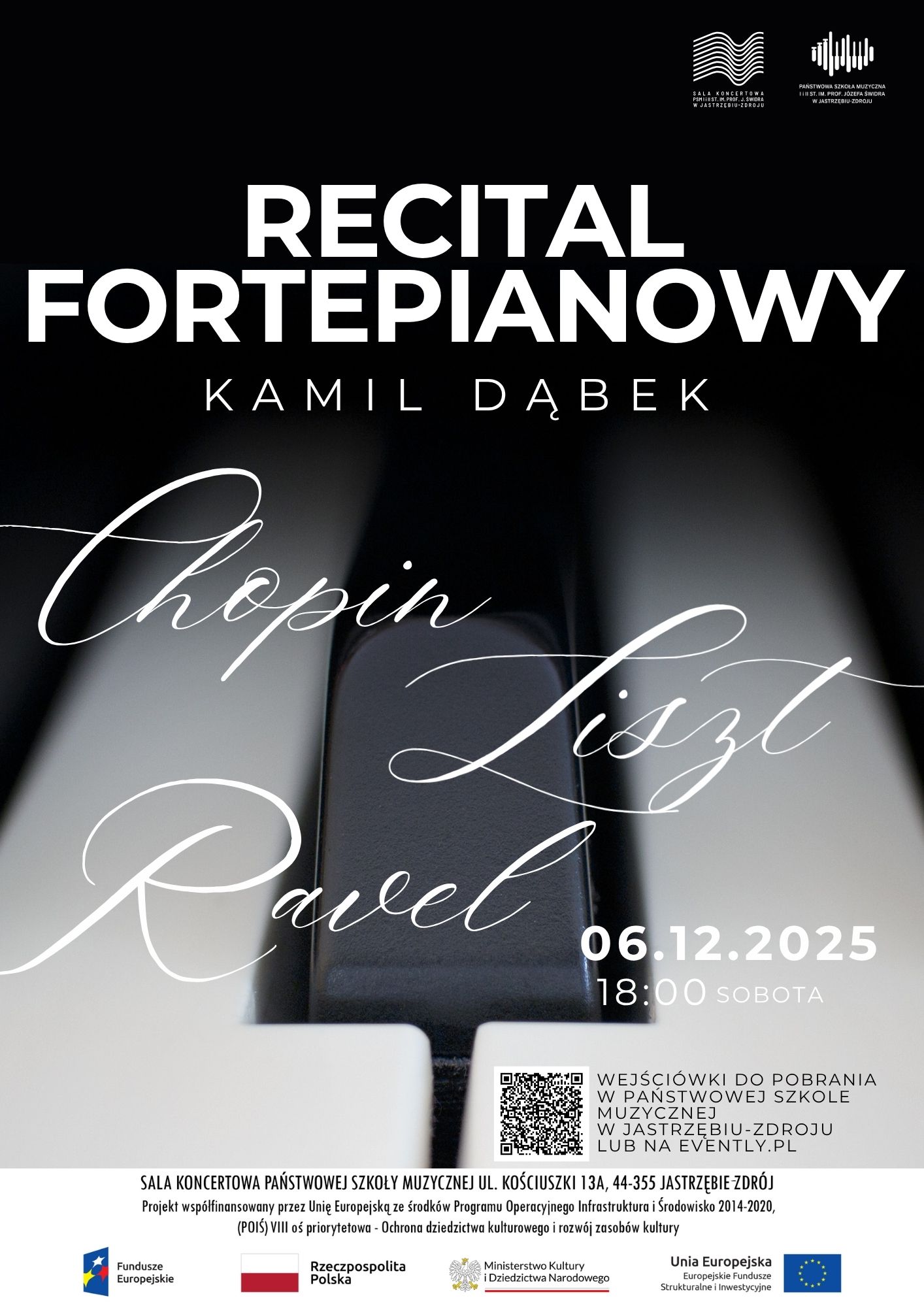 Zapraszamy na Recital fortepianowy w wykonaniu Kamila Dąbka, który odbędzie się 6 grudnia 2025 r. o godzinie 18:00 w Sali Koncertowej Szkoły Muzycznej w Jastrzębiu-Zdroju. Darmowe wejściówki do pobrania w Szkole Muzycznej w Jastrzębiu-Zdroju i na EVENTLY.PL
