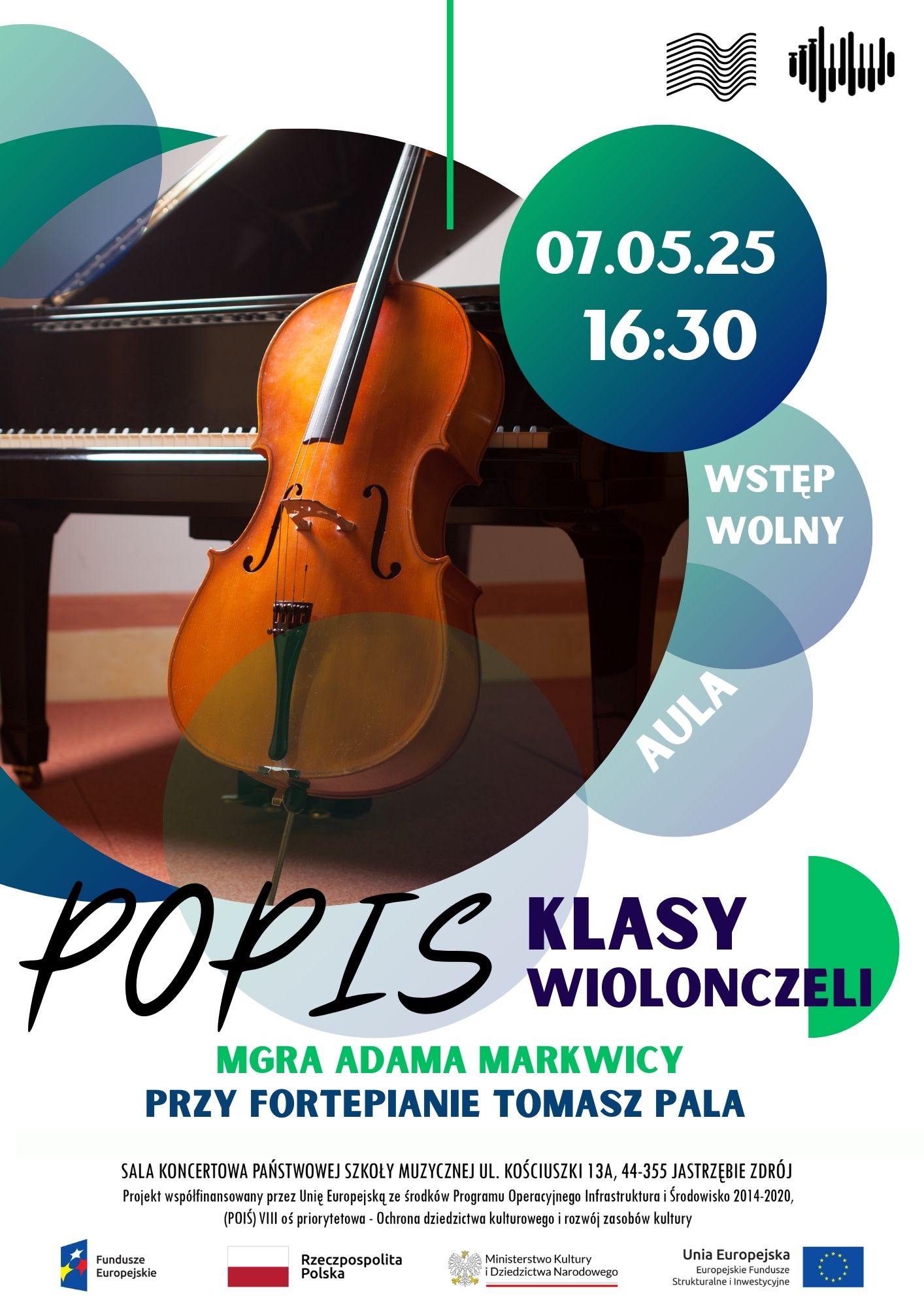 Zapraszamy na Popis klasy wiolonczeli mgr Adam Markwicy przy fortepianie mgr Tomasz Pala, który odbędzie się 7 maja 2025 r. o godzinie 16:30 w Auli Szkoły Muzycznej w Jastrzębiu-Zdroju. Wstęp wolny.