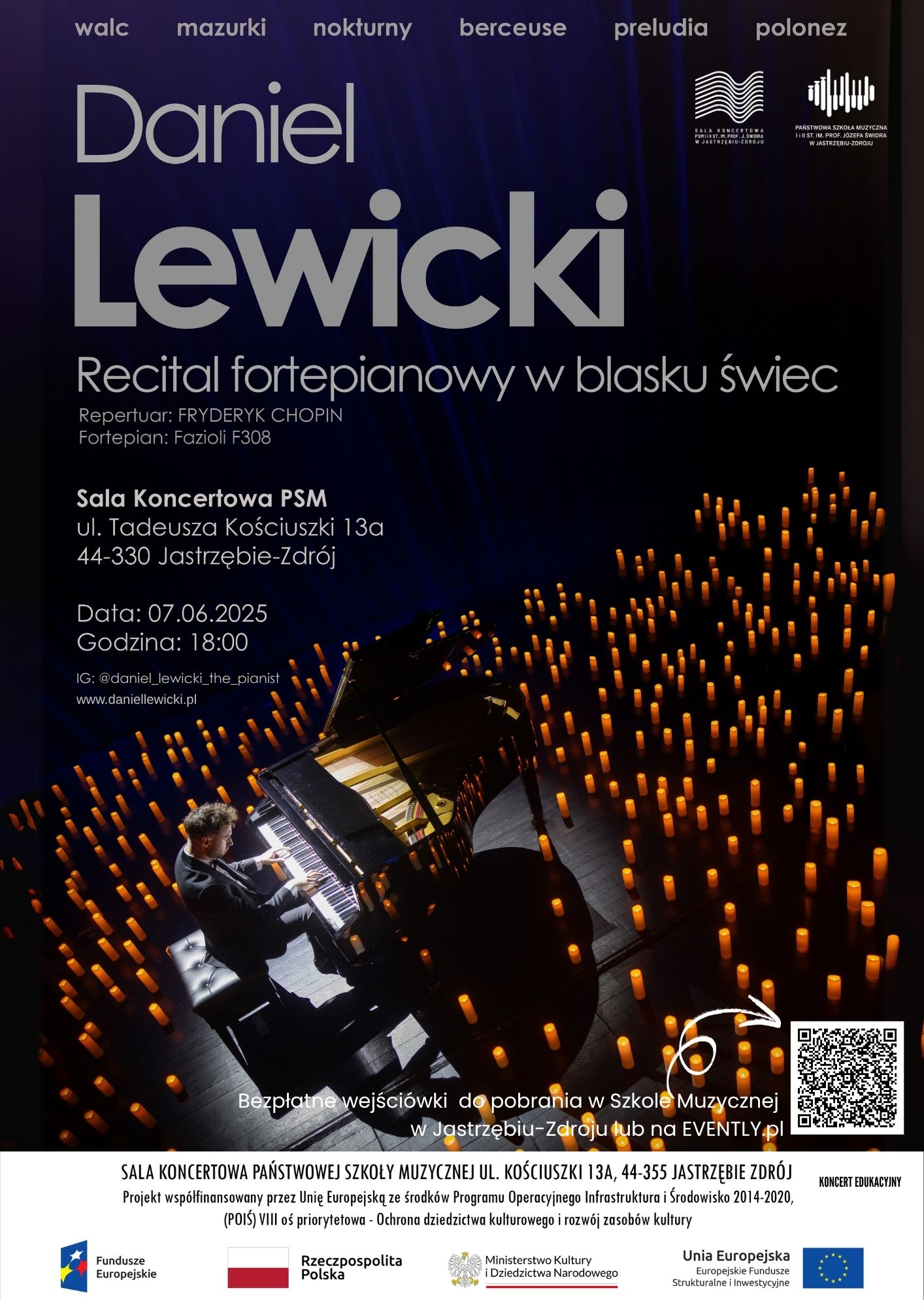 Zapraszamy na Recital fortepianowy w blasku świec Daniela Lewickiego, który odbędzie się 7 czerwca 2025 r. o godzinie 18:00 w Sali koncertowej Szkoły Muzycznej w Jastrzębiu-Zdroju. Bezpłatne wejściówki do pobrania w Państwowej Szkole Muzycznej i na evently.pl